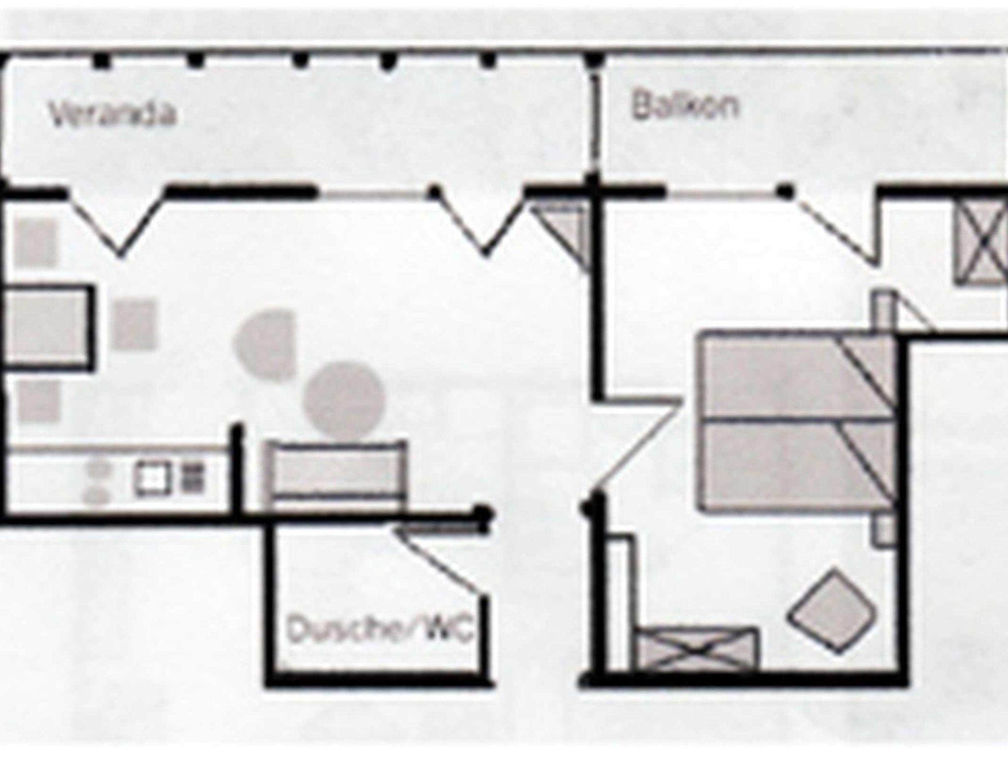 Sie betreten das Appartement durch einen Vorflur. Im großzügigen Wohnraum trennt eine Mauerstutzen die Küchenecke optisch vom Wohnbereich ab. Aus beiden Bereichen führt eine Tür auf die Veranda. Vom Schlafzimmer aus ist der Balkon zu betreten. Bad und WC erreicht man vom Wohnraum aus. Eine tolle Veranda lädt zum Verweilen ein. Es steht Ihnen bei Ihrer Küchenausstattung eine Heißluftfriteuse zur Verfügung.