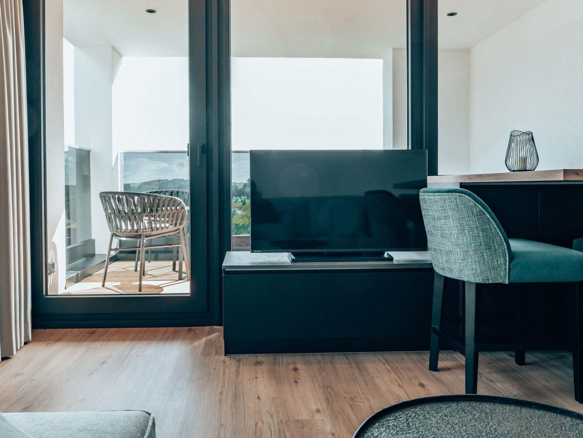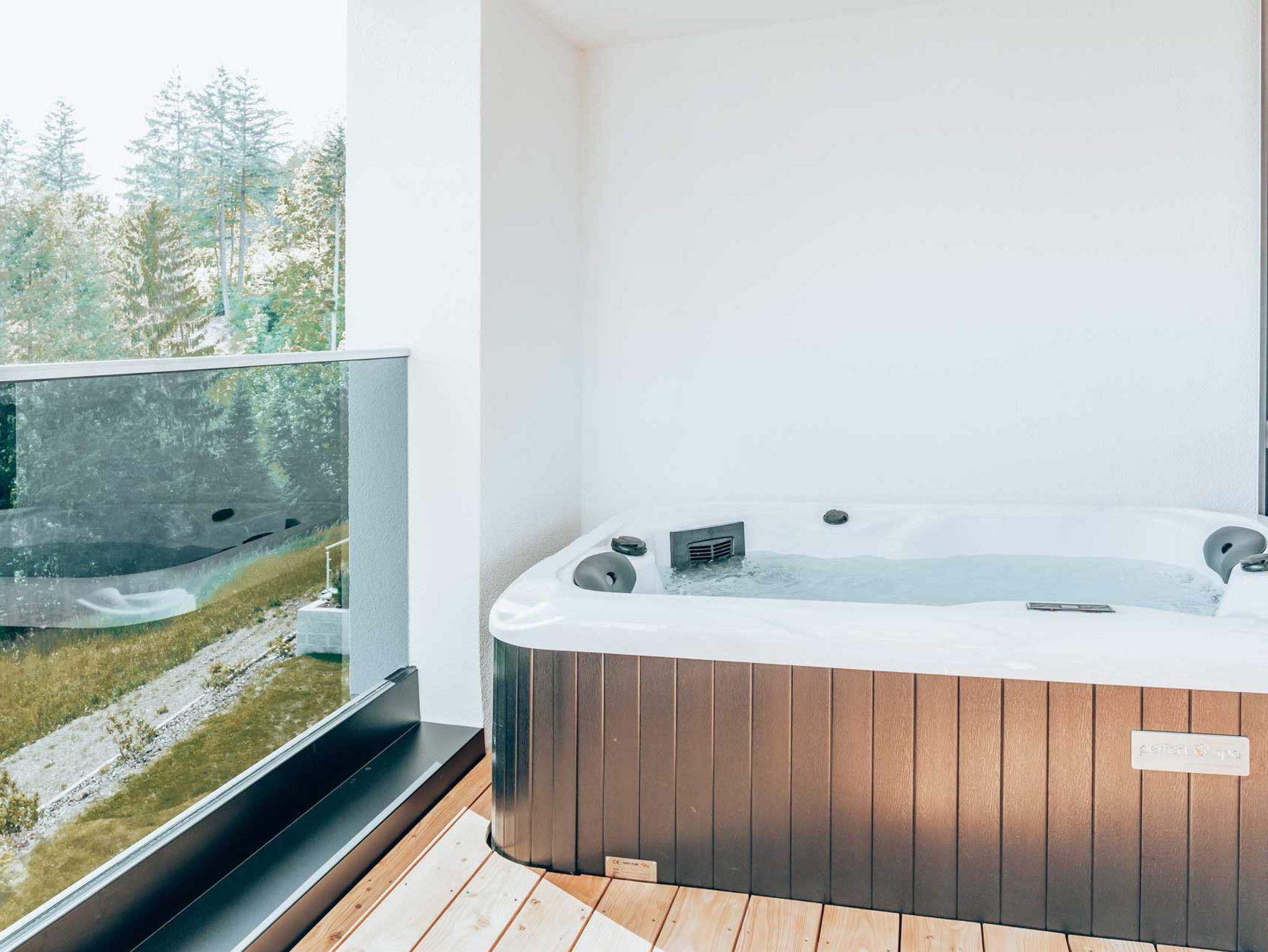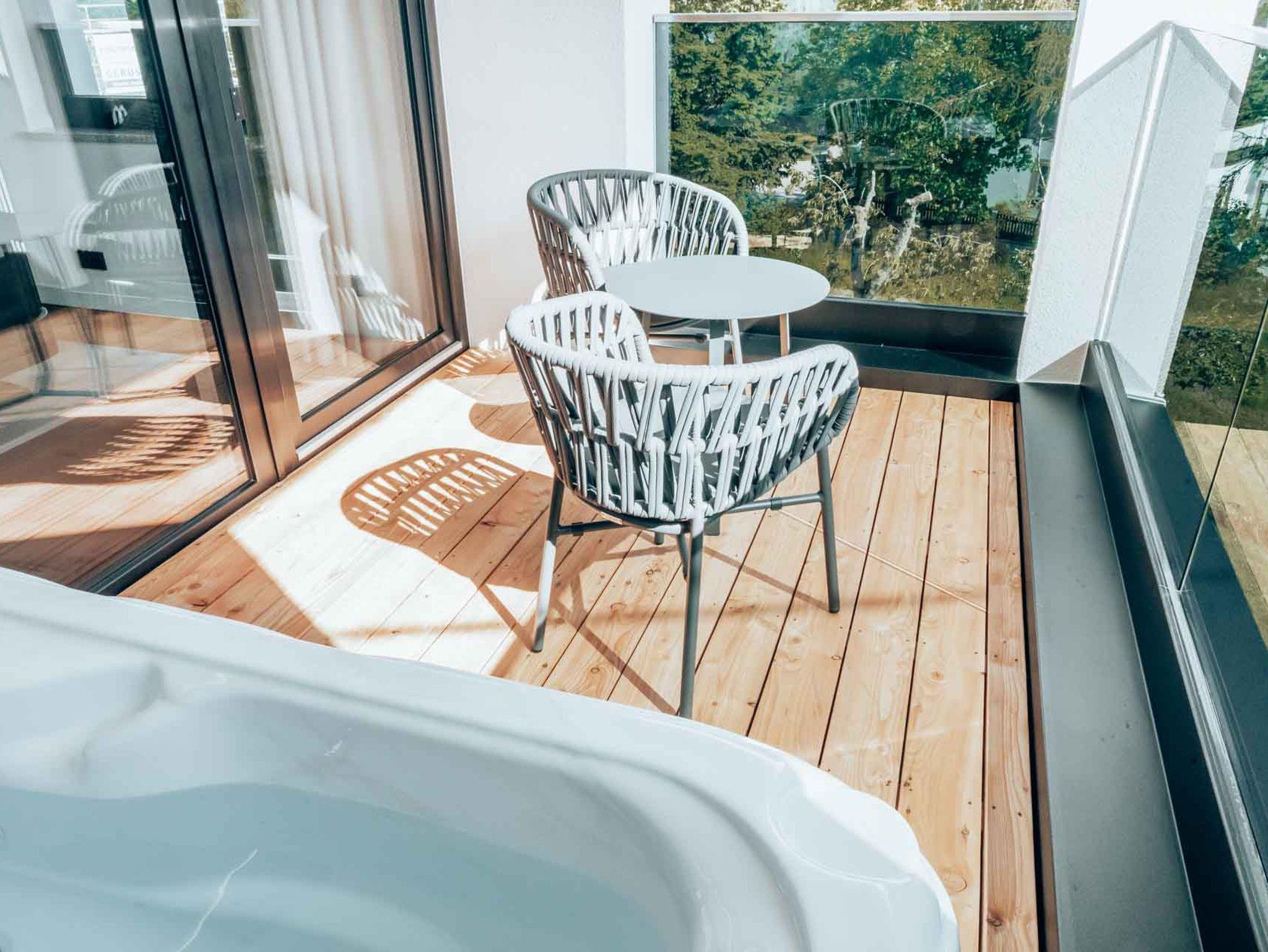 Balkon mit Sitzmöglichkeit, Whirlpool für 2 Personen mit 32 Jet-Düsen, Schlafzimmer mit Kuschelnische & TV, Großzügige Dusche mit Radio & Regendusch-Funktion, Separate Toilette, Küche mit Barbereich, WLAN & TV in Wohn- und Schlafbereich, 65 m²