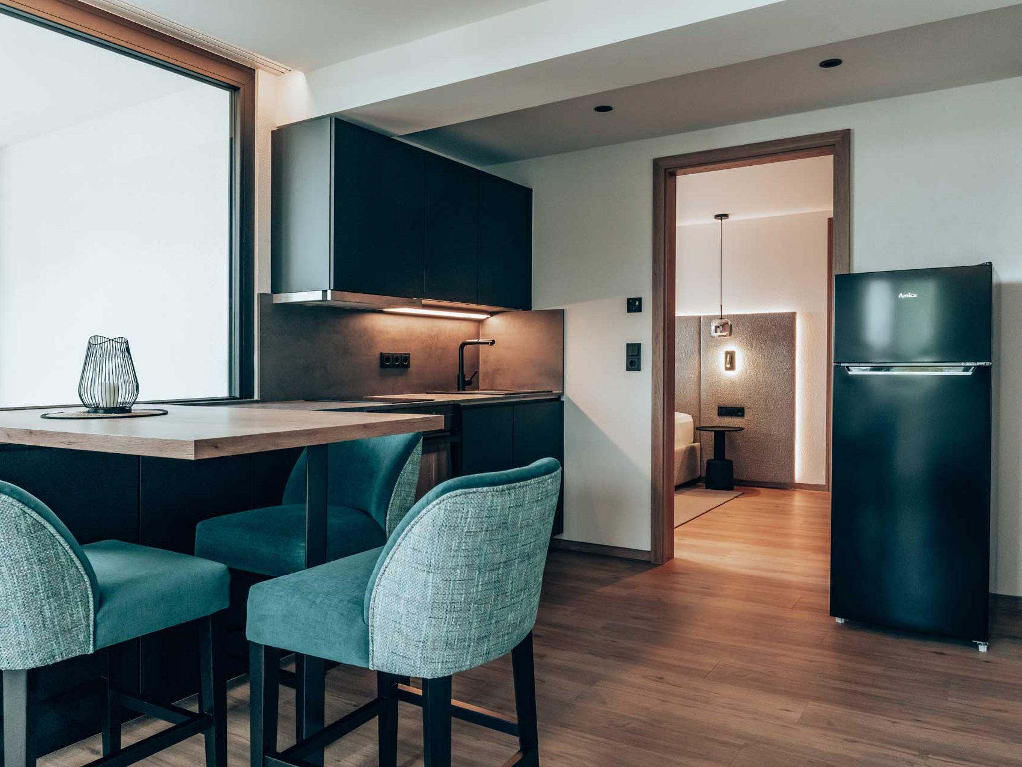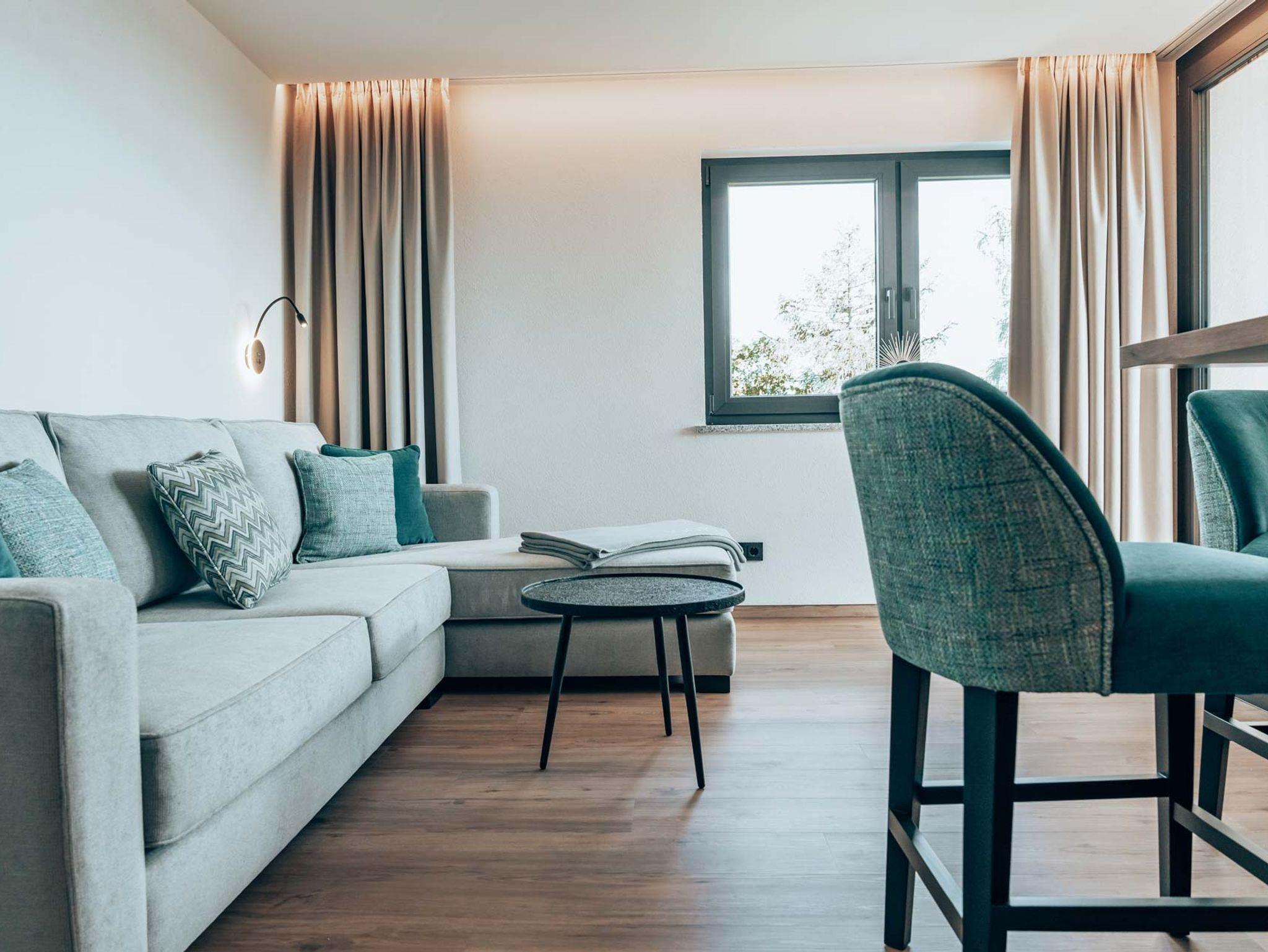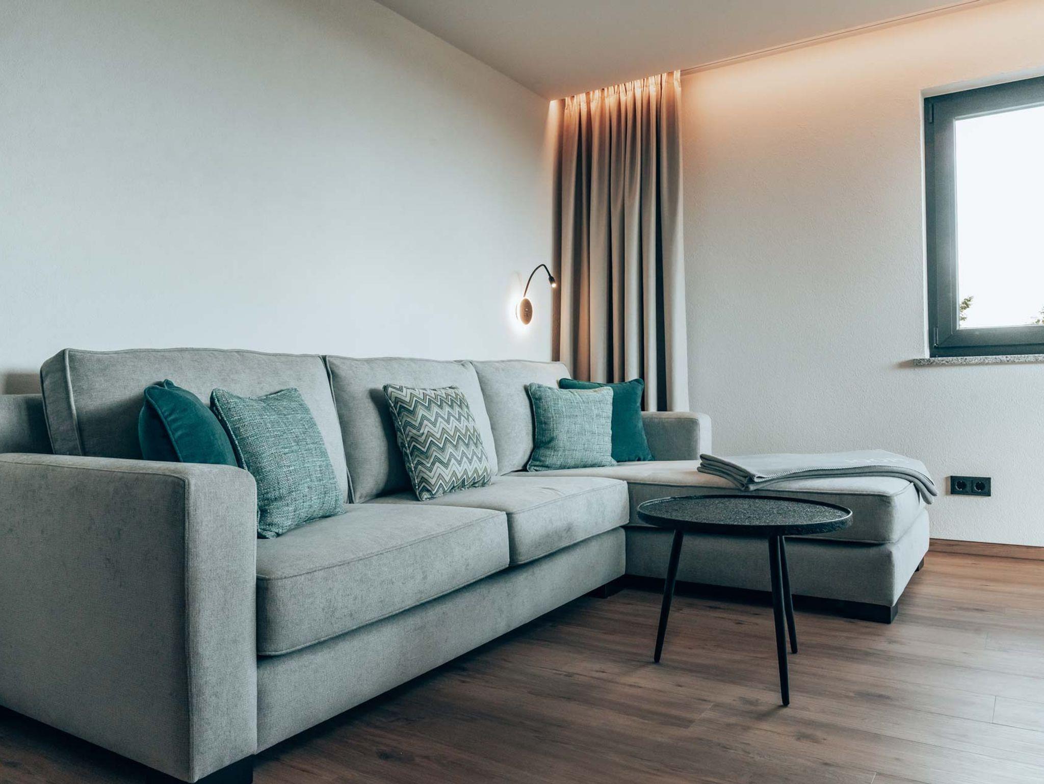 Balkon mit Sitzmöglichkeit, Whirlpool für 2 Personen mit 32 Jet-Düsen, Schlafzimmer mit Kuschelnische & TV, Großzügige Dusche mit Radio & Regendusch-Funktion, Separate Toilette, Küche mit Barbereich, WLAN & TV in Wohn- und Schlafbereich, 65 m²