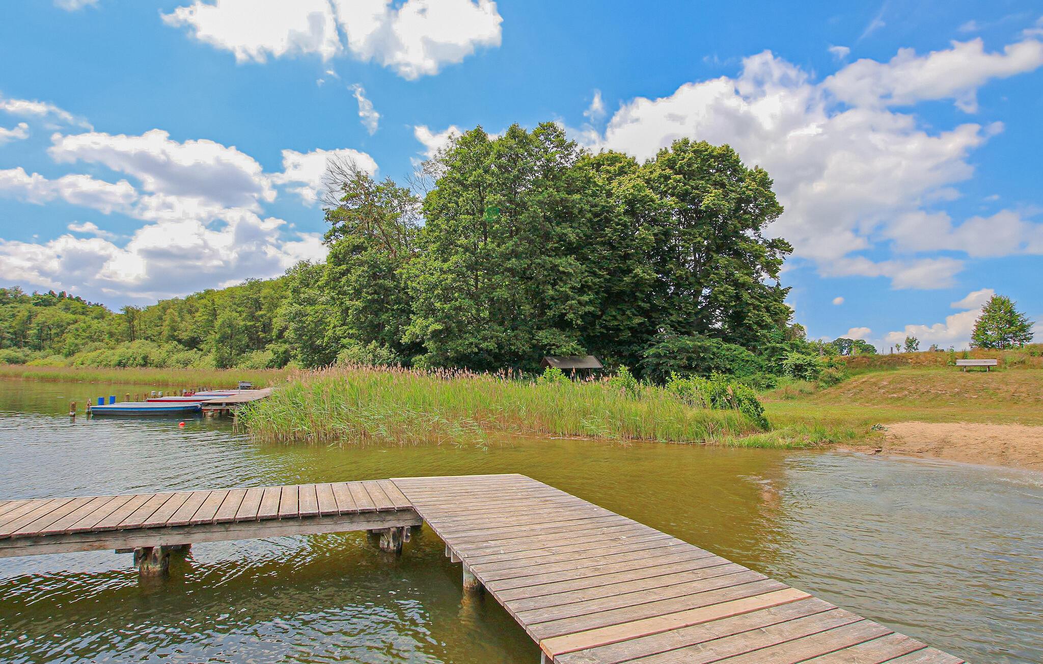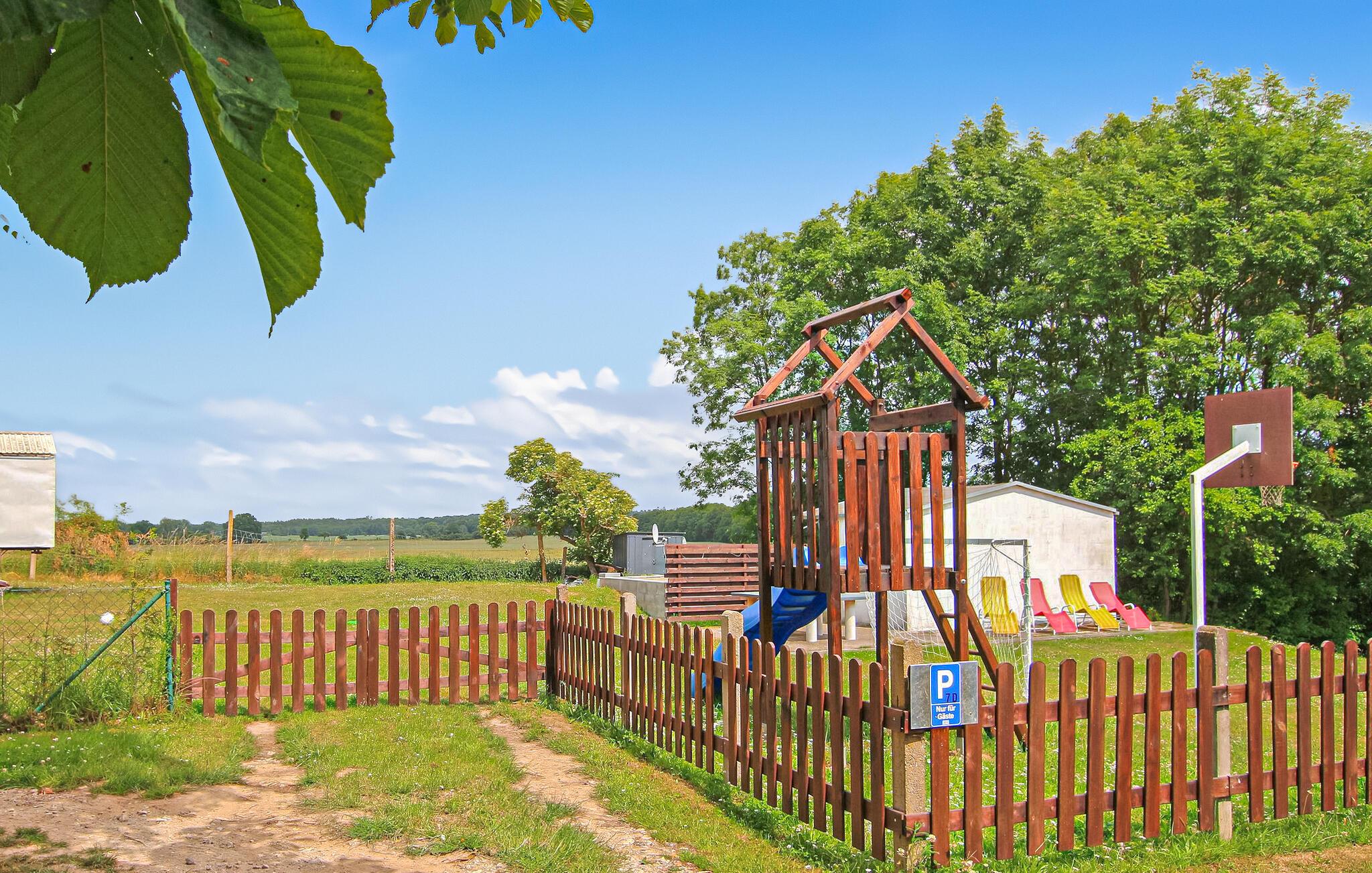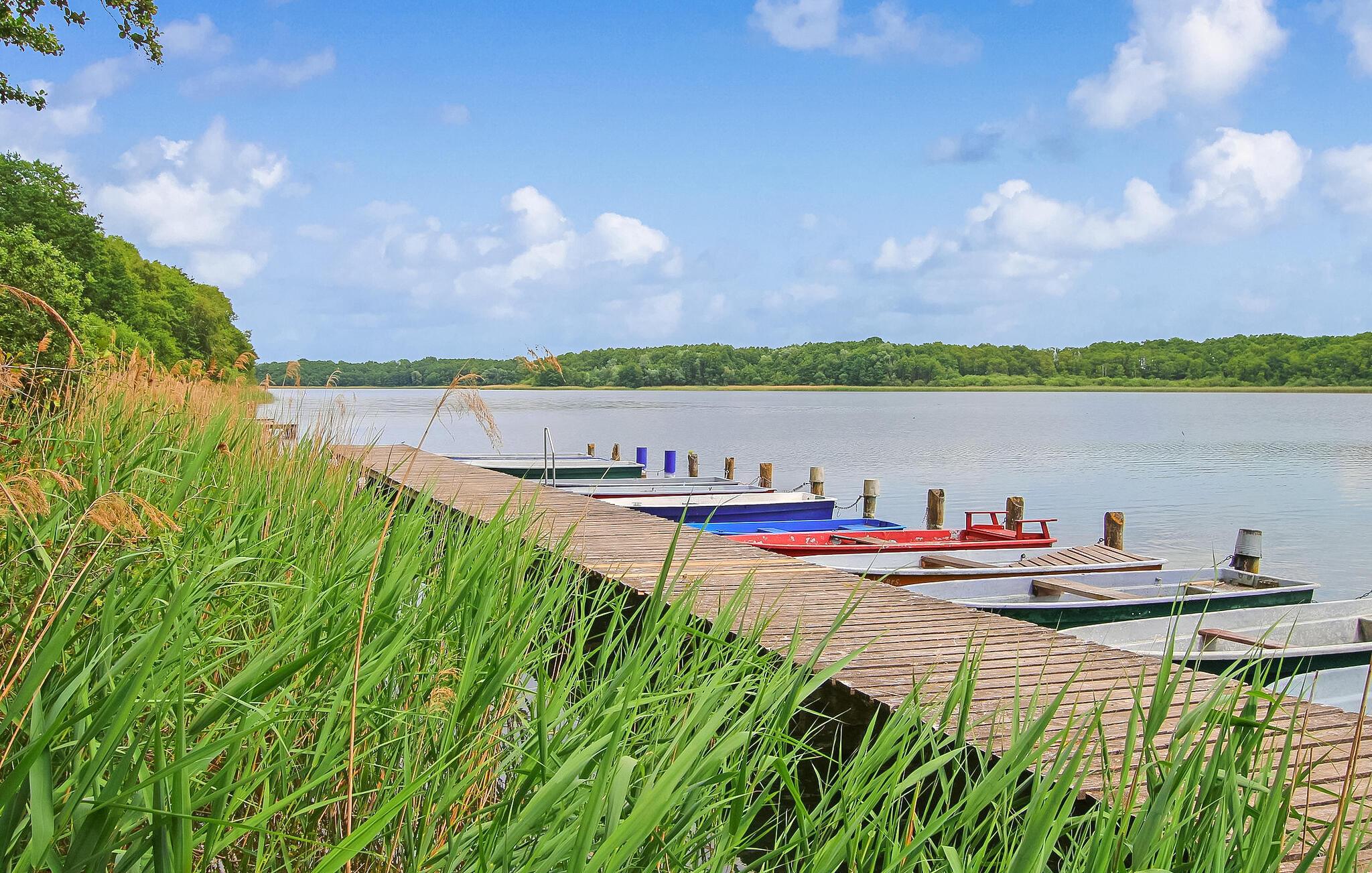 Weiterhin stehen für beide Wohnungen Parkplätze, auf dem Grundstück ein kleiner Spielplatz (Rutsche, Sandkasten, Fußballtor, Basketballkorb), eine Tischtennisplatte, Grill, Räucherofen, eine gemeinsam nutzbare überdachte Sitzecke, Sonnenliegen, ein Fahrradabstellraum (abschließbar) je ein Ruderboot (Anker 4), Angelkarten sowie ein Wassertreter zur Verfügung. Nach Absprache Fahrradverleih möglich.