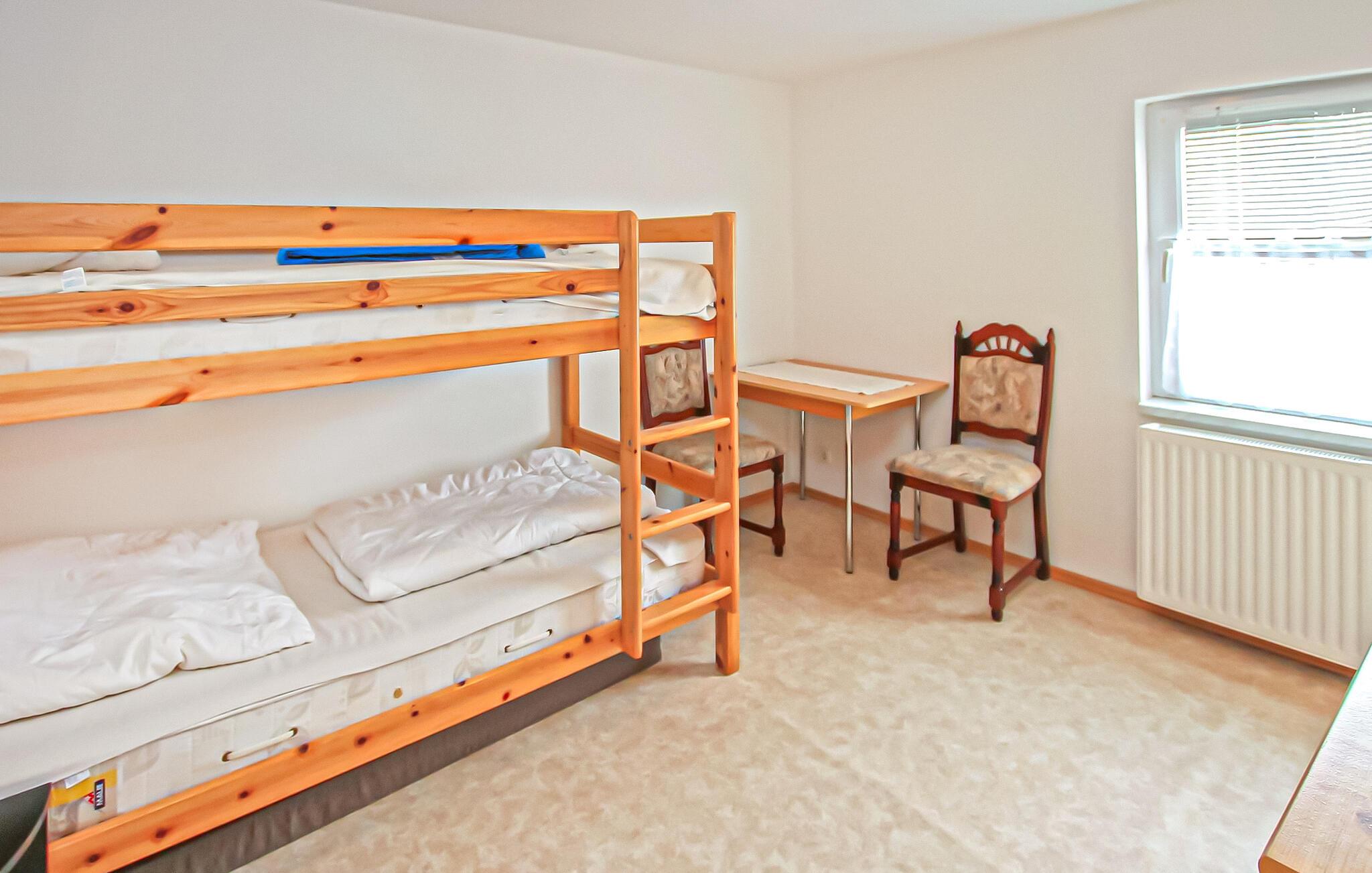 Die ca. 55 qm große Nichtraucherwohnung für bis zu 6 Erwachsene und 1 Kleinkind (3 Jahre) liegt im Erdgeschoss und verfügt über einen separaten Eingang. Es gibt ein großes Wohnzimmer (Schlafsofa - Zusatzbett für 2 Personen, Flachbildfernseher, Radio/CD-DVD-Player) mit offener Küche (Elektroherd mit Backofen, Kühlschrank, Mikrowelle, diverse kleine Küchengeräte), zwei Schlafzimmer (1 x 2 zusammenstellbare Einzelbetten, Kinderbett, 1 x Etagenbett), ein Badezimmer (Dusche, WC, Fön). Die Wohnung ist zentral beheizt und verfügt über Insektenschutz an den Fenstern, einen Flur und eine möblierte Terrasse.