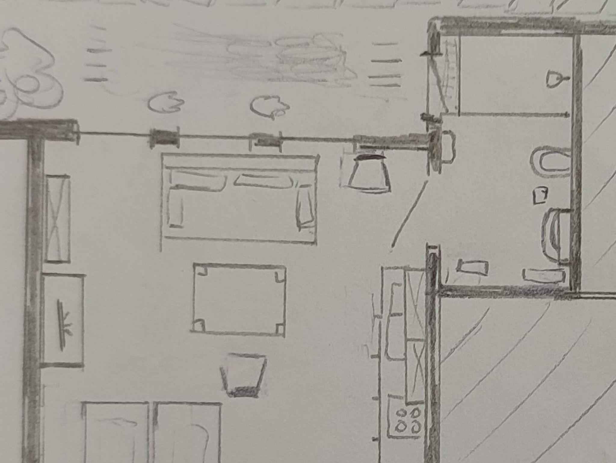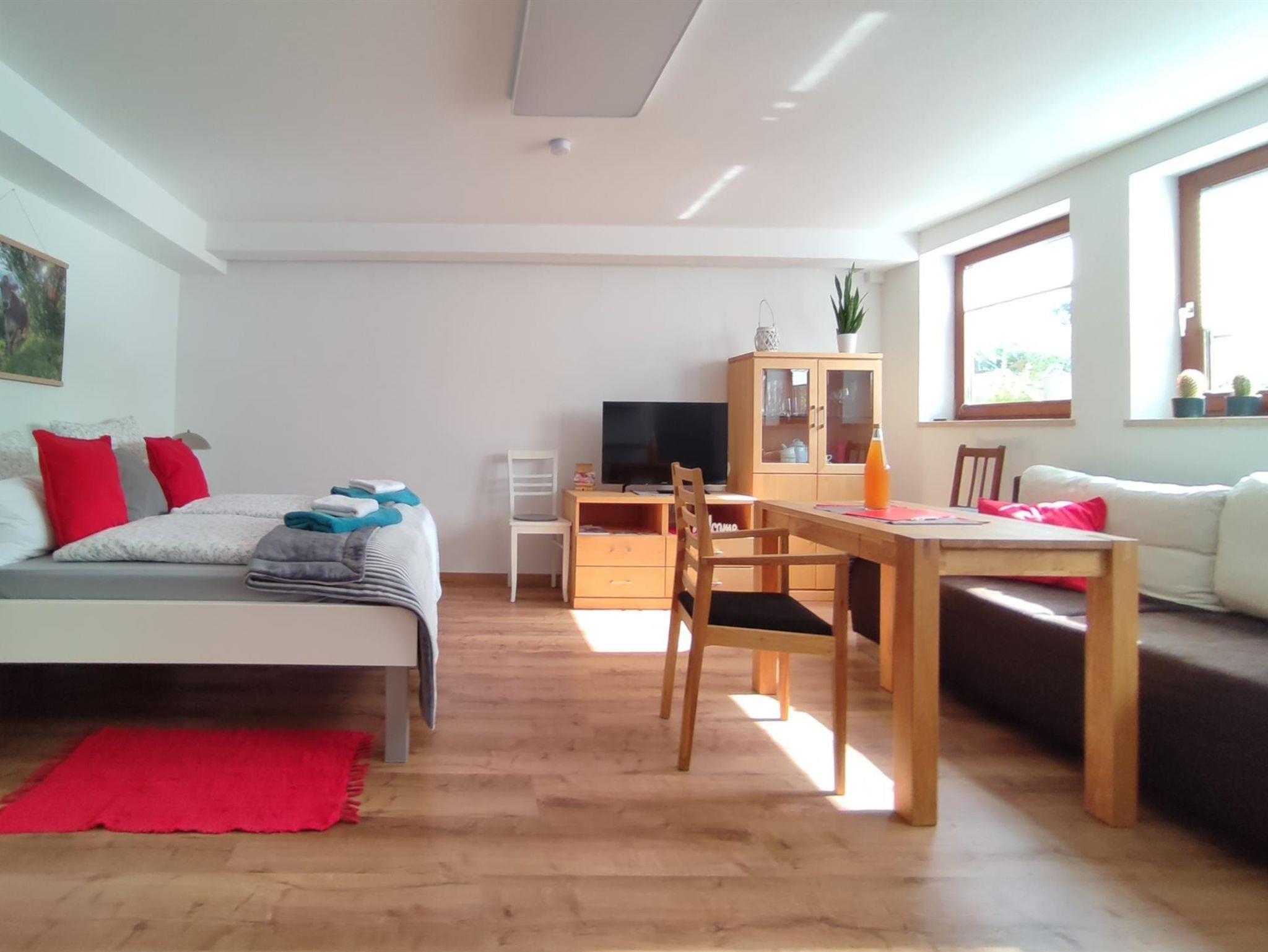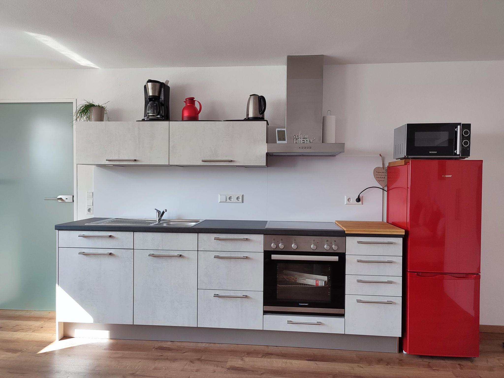Der Wohn/Schlafraum mit gemütlichem Schlaf-Sofa und Smart-TV wird durch die voll ausgestattete Küchenzeile ergänzt (Backofen, Mikrowelle, Kühl/Gefrierkombi, Toaster, Töpfe, Geschirr, Kaffeemaschine und Wasserkocher…)