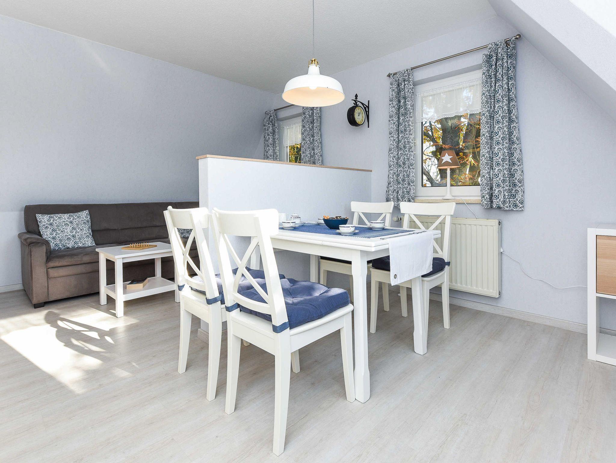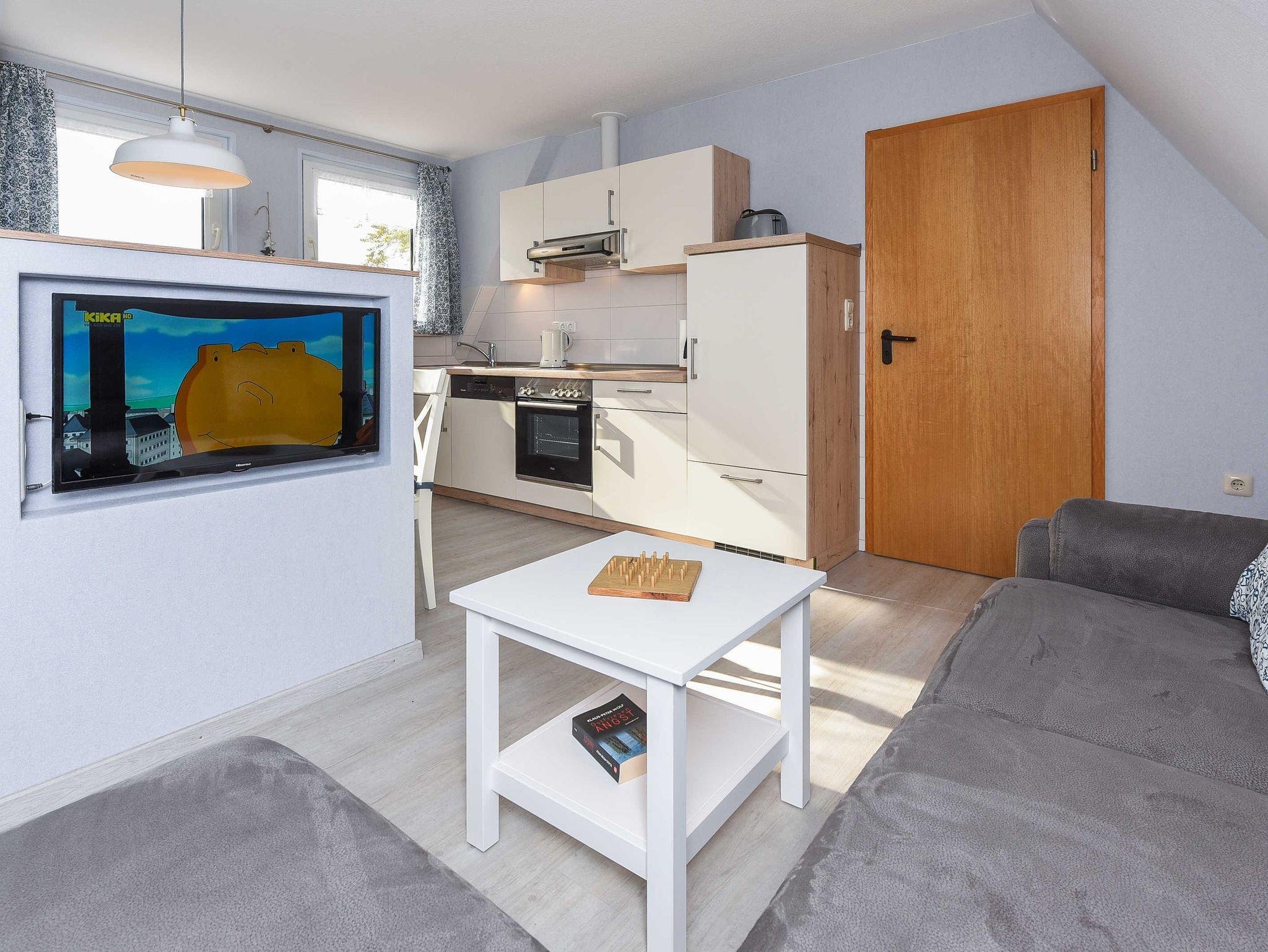 Größe ca. 65 Quadratmeter, Wohnraum mit integrierter Küche, Schlafzimmer, zweites separates Schlafzimmer, Badezimmer mit Dusche, Waschtisch und WC, Obergeschoss, Parkplatz (reserviert), optimal für 2 bis 4 Personen.