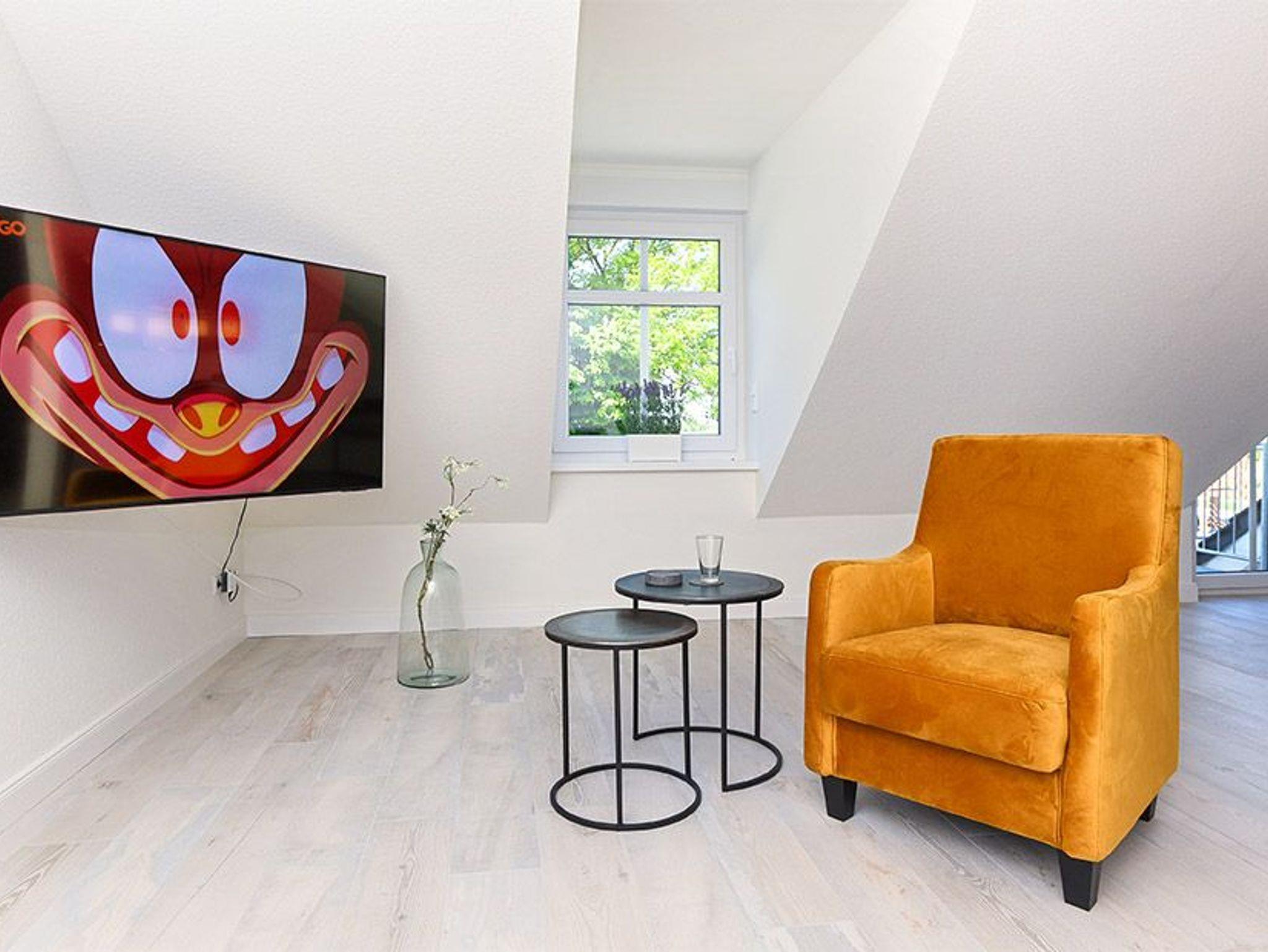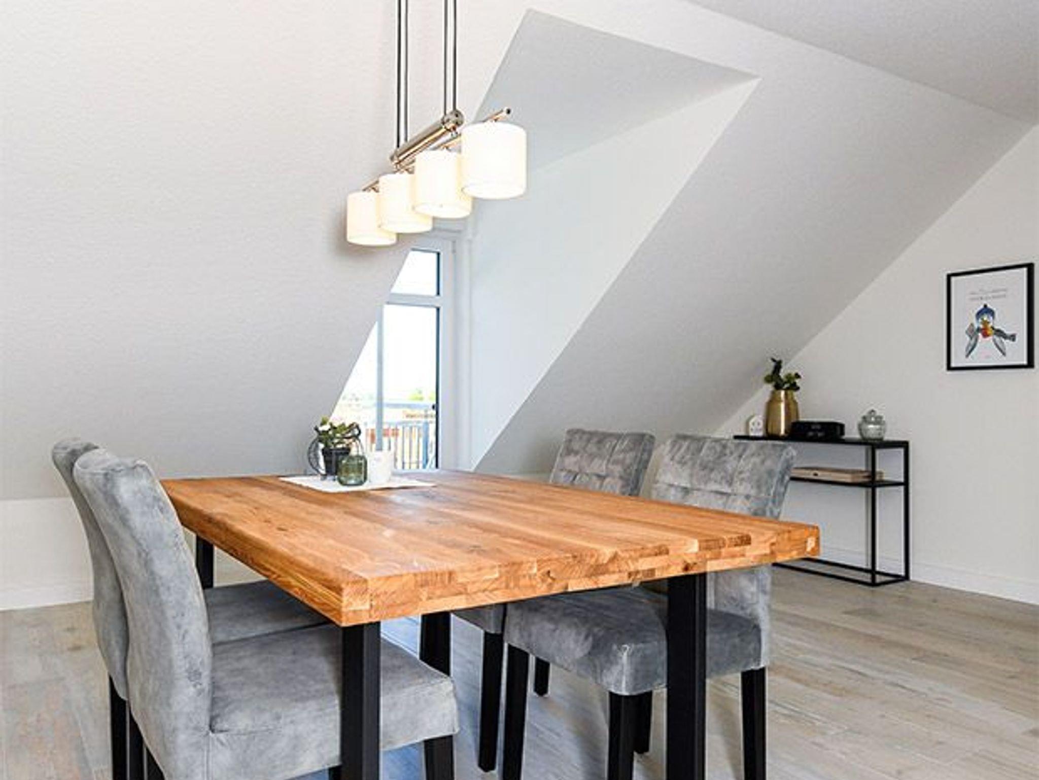 Größe ca. 80 Quadratmeter, Wohnraum mit integrierter Küche, Schlafzimmer, zweites separates Schlafzimmer/Kinderzimmer, Badezimmer mit Dusche, Waschtisch und WC, Obergeschoss, Balkon, optimal für 2 bis 4 Personen.
