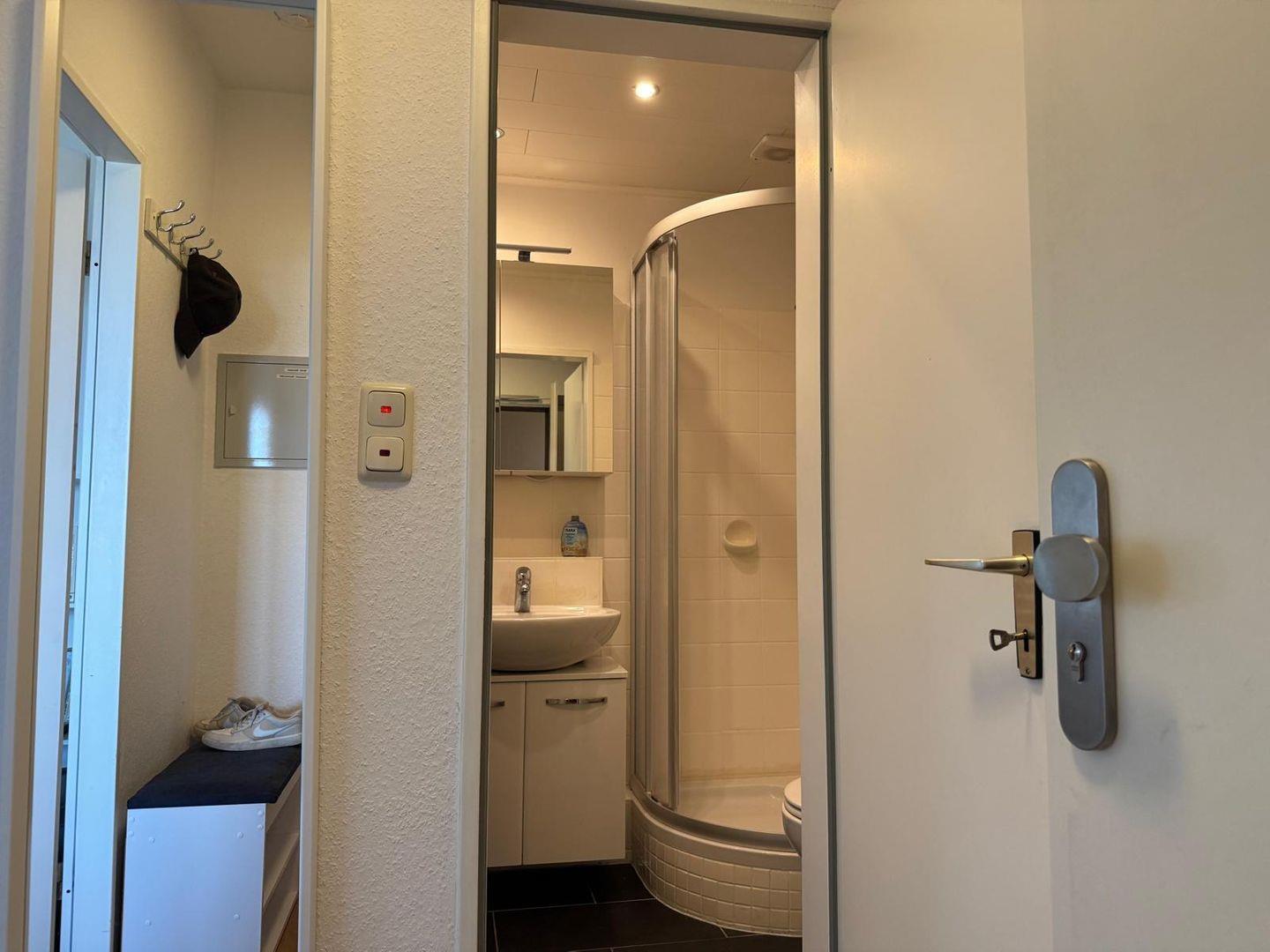 Das kleine Bad ist zweckmäßig und verfügt über Dusche, Waschbecken mit Spiegelschrank, WC sowie einem Handtuchwärmer und Fön.