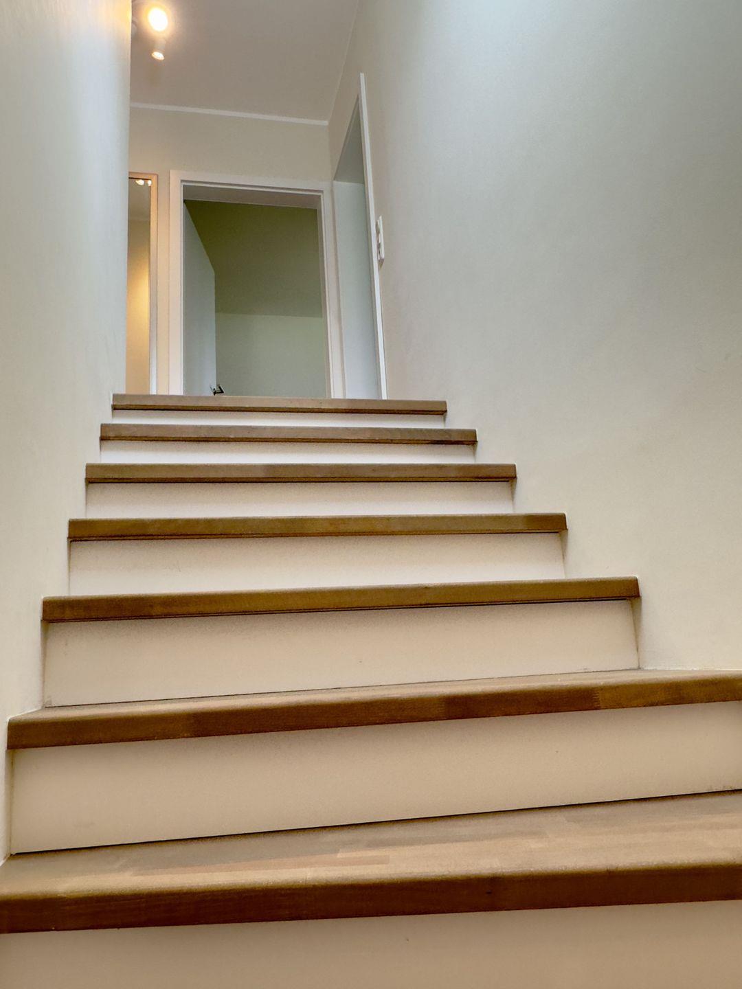 Über die offene Holztreppe gelangen Sie in die erste Etage.