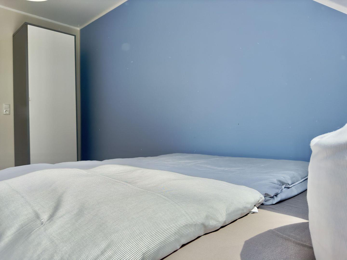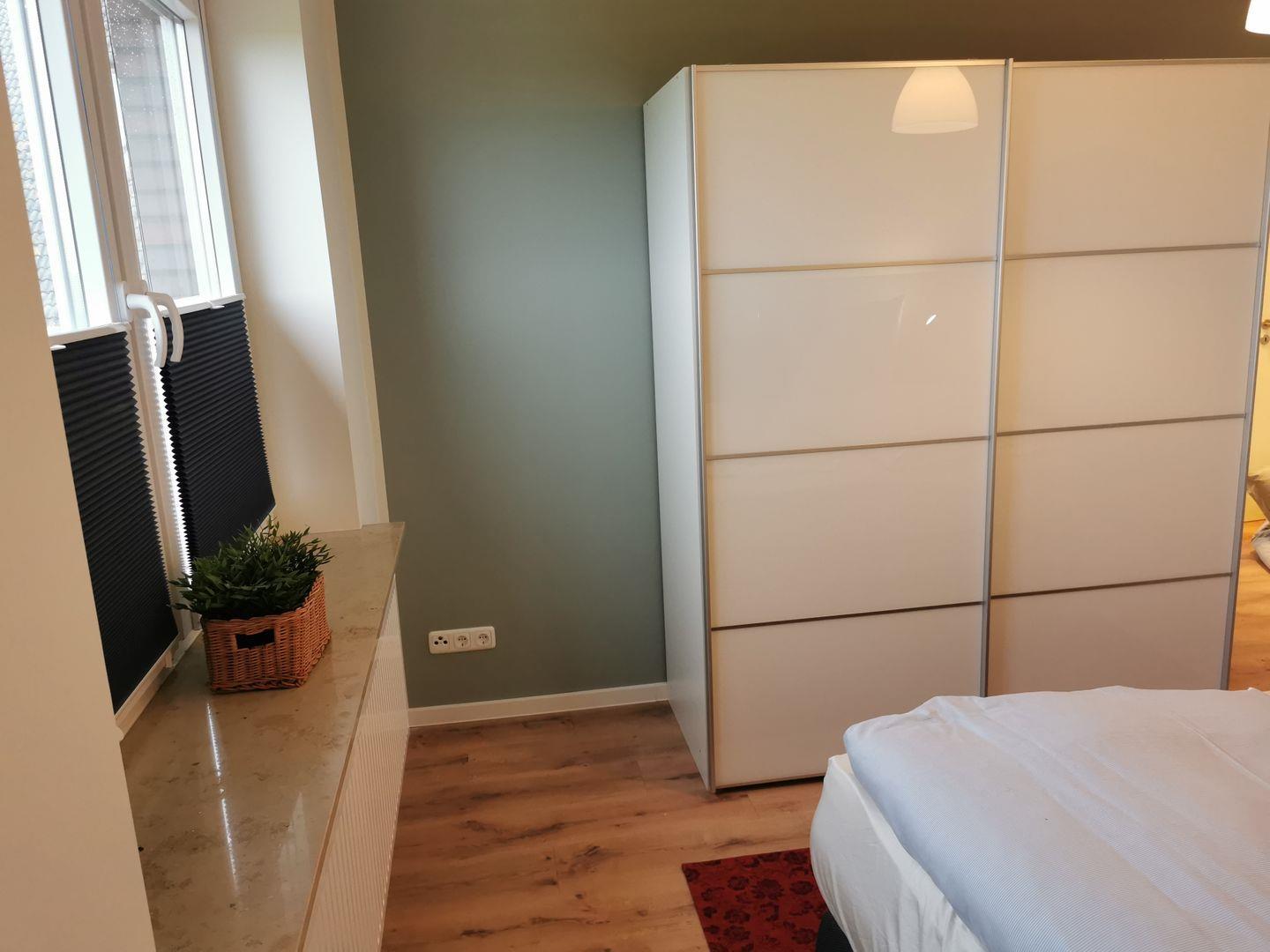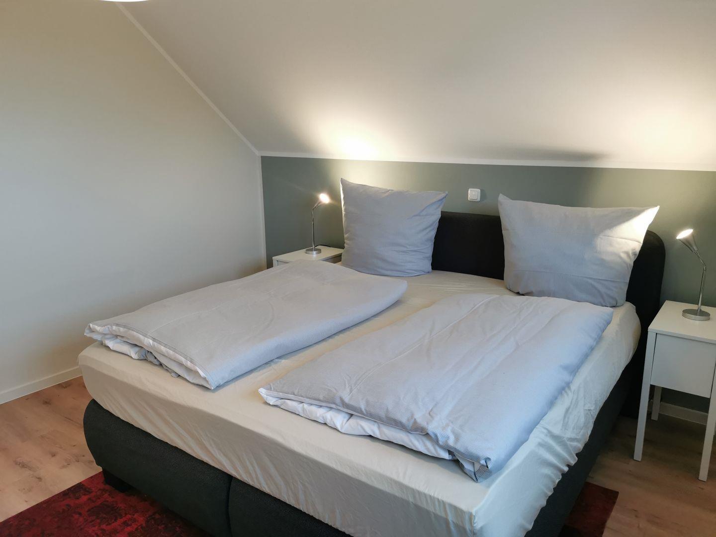 Das Schlafzimmer mit Boxspringbett und geräumigem Kleiderschrank bietet Ihnen den Raum, den Sie für einen erholsamen Aufenthalt benötigen. Im zweiten Schlafzimmer finden Sie ein gemütliches Doppelbett und einen praktischen Kleiderschrank.