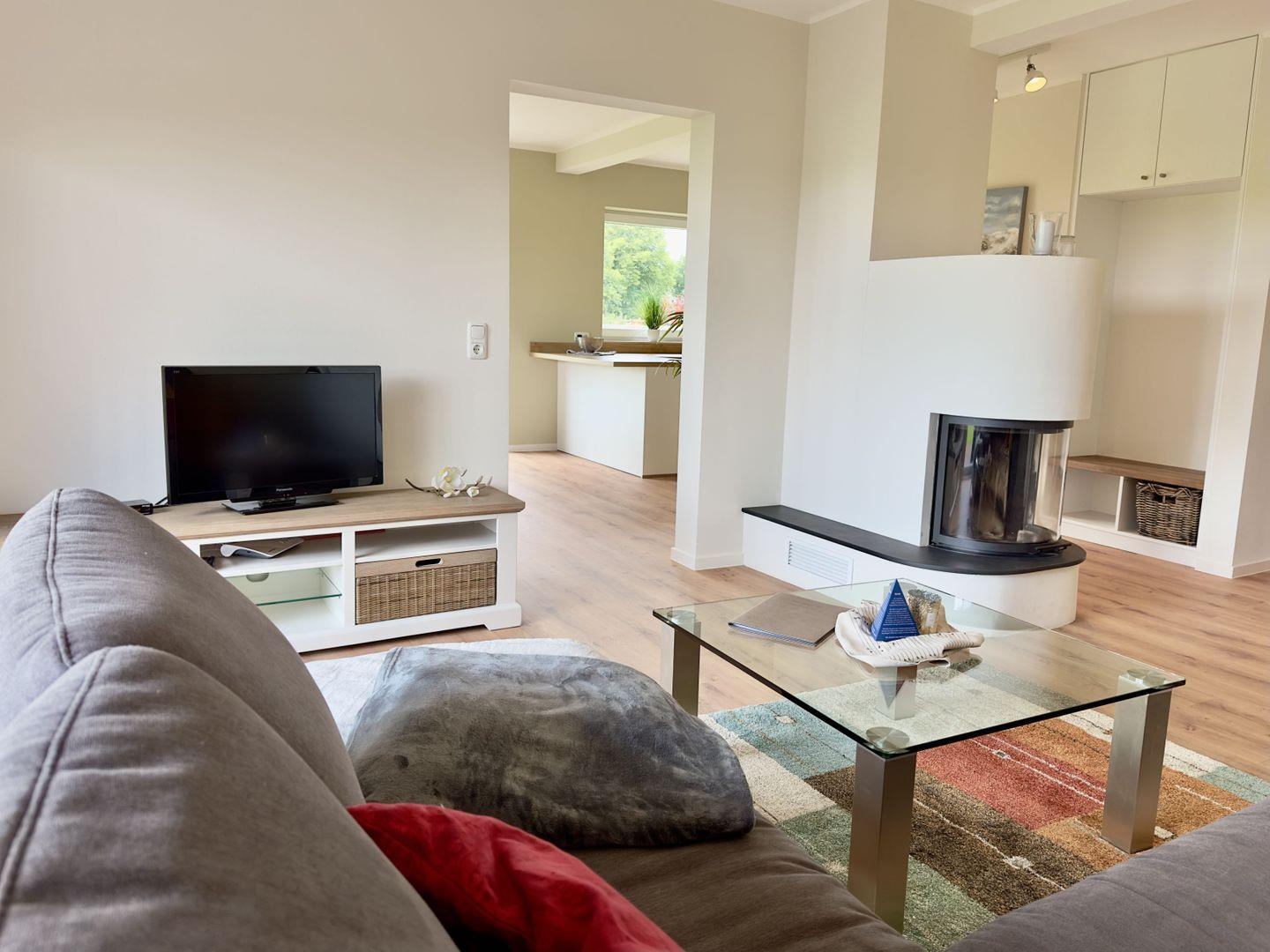 Die lichtdurchfluteten Räume, der gemütliche Kaminofen und die hochwertige Ausstattung schaffen eine einladende Atmosphäre.