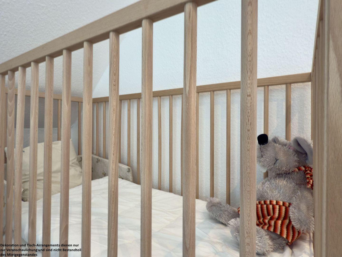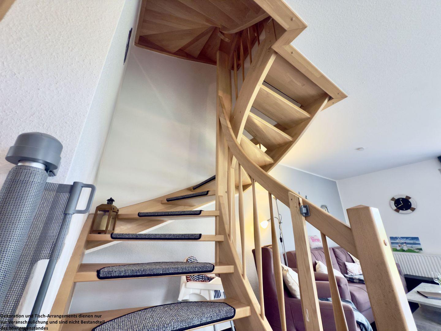 Über eine stabile Holztreppe erreichen Sie die erste Etage mit zwei liebevoll gestalteten Schlafzimmern.