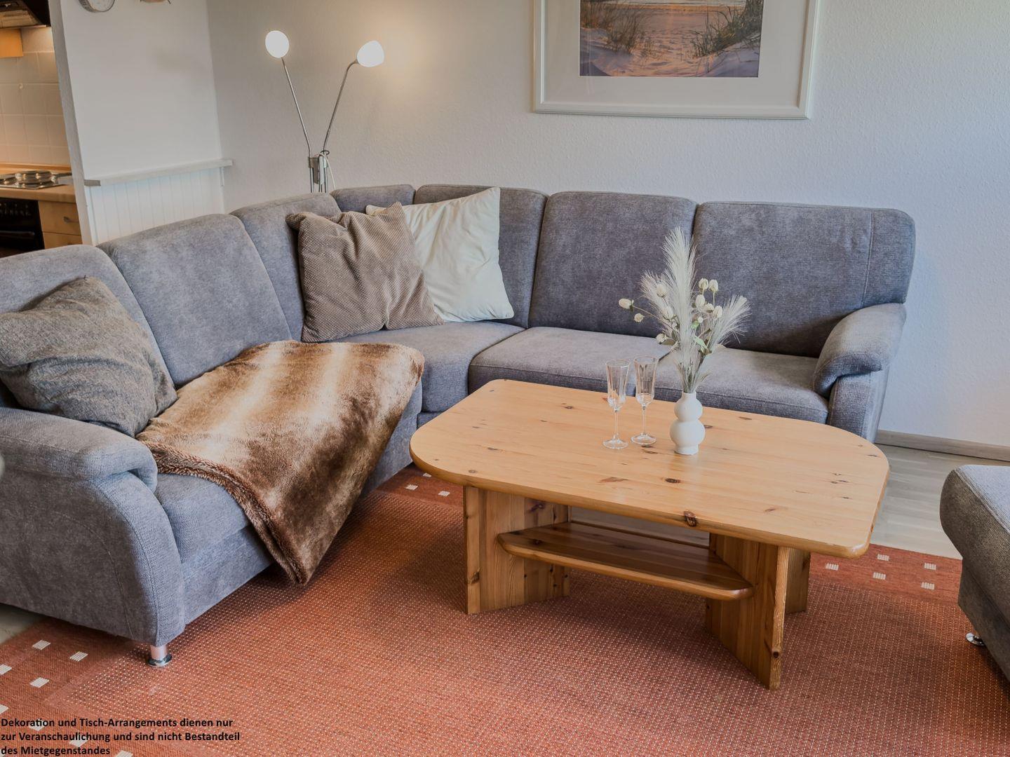 Das Wohnzimmer ist das Herzstück der Wohnung. Eine große, bequeme Couch lädt zu entspannten Abenden ein – ob beim Lesen, beim gemeinsamen Spielen oder einfach beim Ausruhen nach einem Tag am Strand. Durch die breite Terrassentür fällt viel Tageslicht in den Raum und eröffnet den Blick in den kleinen, liebevoll angelegten Garten, der von einer grünen Hecke geschützt ist. Hier finden Sie Ruhe und Geborgenheit. Gartenmöbel und ein Elektrogrill stehen im Gartenhaus bereit, sodass laue Sommerabende bei einem Glas Wein oder einem gemeinsamen Grillabend zum besonderen Urlaubsmoment werden.