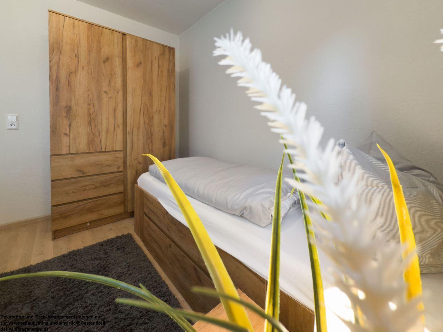 Das zweite Schlafzimmer verfügt über zwei komfortable Einzelbetten und greift ebenfalls die warmen Töne auf – ein idealer Rückzugsort für Kinder, Freunde oder weitere Familienmitglieder.