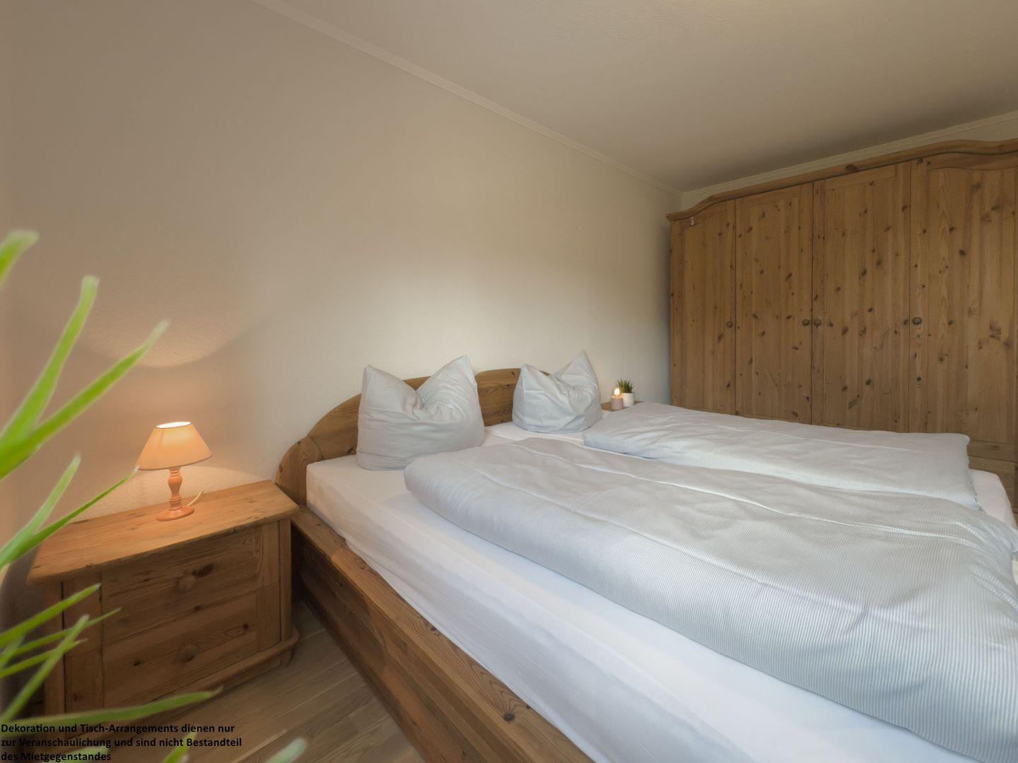 Das Hauptschlafzimmer überzeugt mit einem stilvollen Holzbett und warmen Holzmöbeln, die eine behagliche Wohlfühlatmosphäre verbreiten.