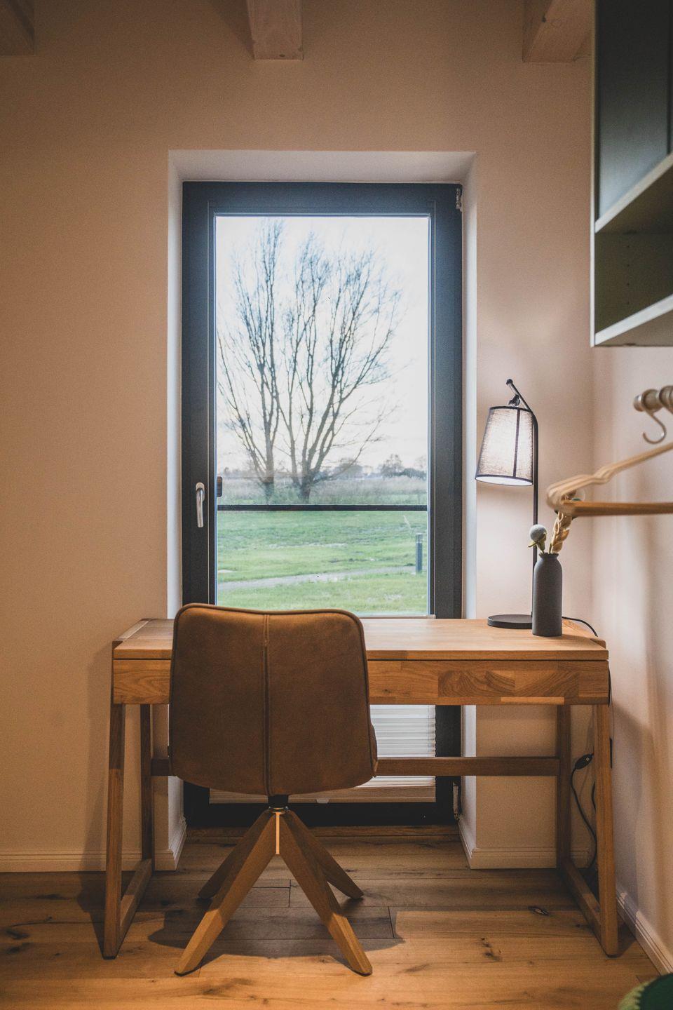 Außerdem befindet sich im Erdgeschoss noch ein kleines Zimmer welches sowohl als Arbeitsbereich aber auch als zusätzliches Schlafzimmer (Schlafsofa mit vollwertiger Matratze 200 x 140 cm) genutzt werden kann. Der Erdgeschossbereich sowie dieses Schlafzimmer und das Bad im Erdgeschoss sind barrierefrei gestaltet. Zum Eingang der Wohnung führt nur eine Stufe. Eine mobile, klappbare Rollstuhlrampe gehört zur Ausstattung der Ferienwohnung.