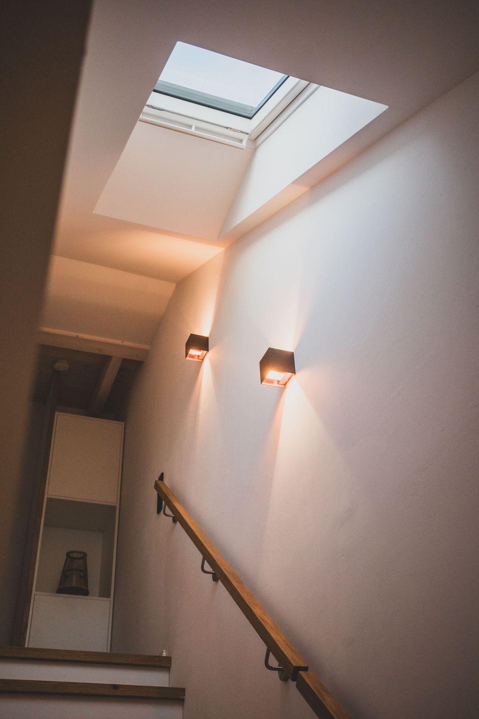 Das Obergeschoss verfügt neben Bad und Sauna über 2 geschmackvoll eingerichtete Schlafzimmer. Eines mit Doppelbett 200 × 180 cm und nach Westen ausgerichteten großen Fenstern und eines ebenfalls mit Doppelbett 200 × 180 cm, mit einem direkt über dem Bett positionierten Dachfenster welches traumhafte Blicke in den Sternenhimmel ermöglicht.