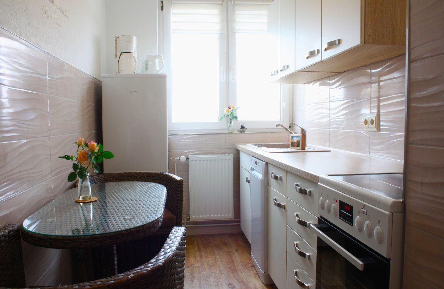 Die separate Küche ist vollwertig eingerichtet, unter Anderem mit einer Spülmaschine, Kaffeemaschine, Kühlschrank inkl. Gefrierschubladen, Toaster, Mixer und Wasserkocher. Zur Ausstattung der Küche gehört ebenfalls noch ein kleiner Esstisch mit 2 Stühlen.