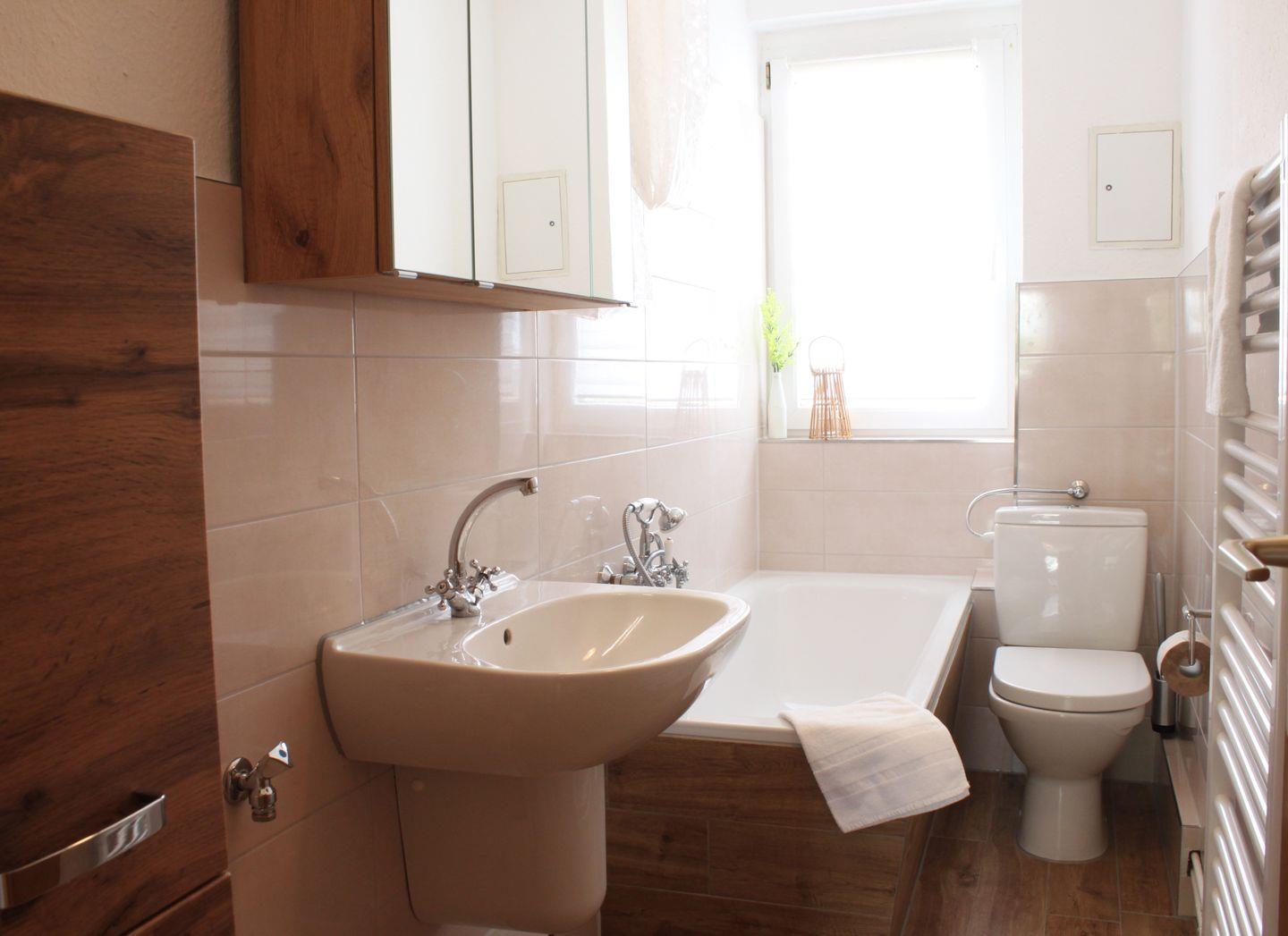 Das Badezimmer mit Fenster verfügt über eine Badewanne und einen Fön.