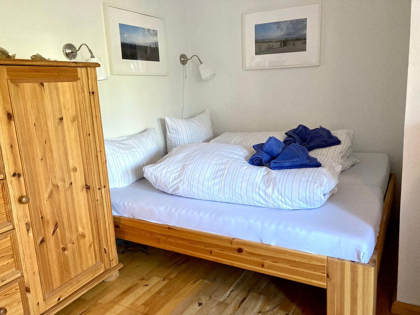 Im Schlafzimmer befindet sich dann 1 Doppelbett, sowie ein Einzelbett.