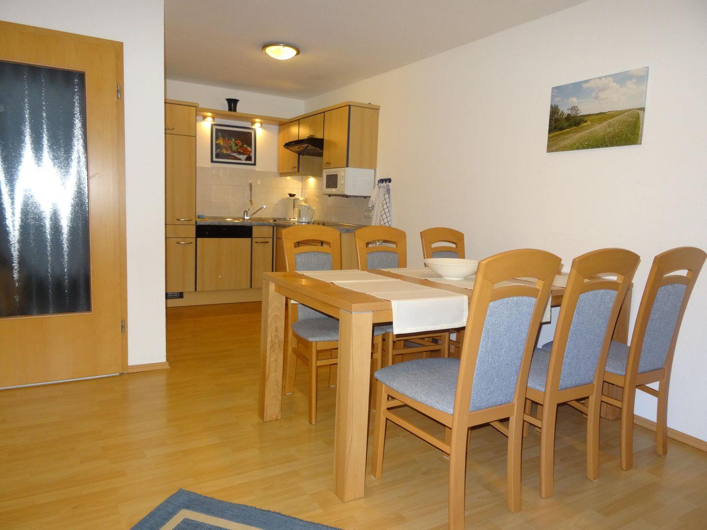 Der gemütliche Wohn-/Essbereich ist schön hell u lädt zum Verweilen ein. Von hier aus gelangen Sie auch auf den Südbalkon. Die Küche bietet alles, was Sie für eine bequeme Selbstverpflegung benötigen