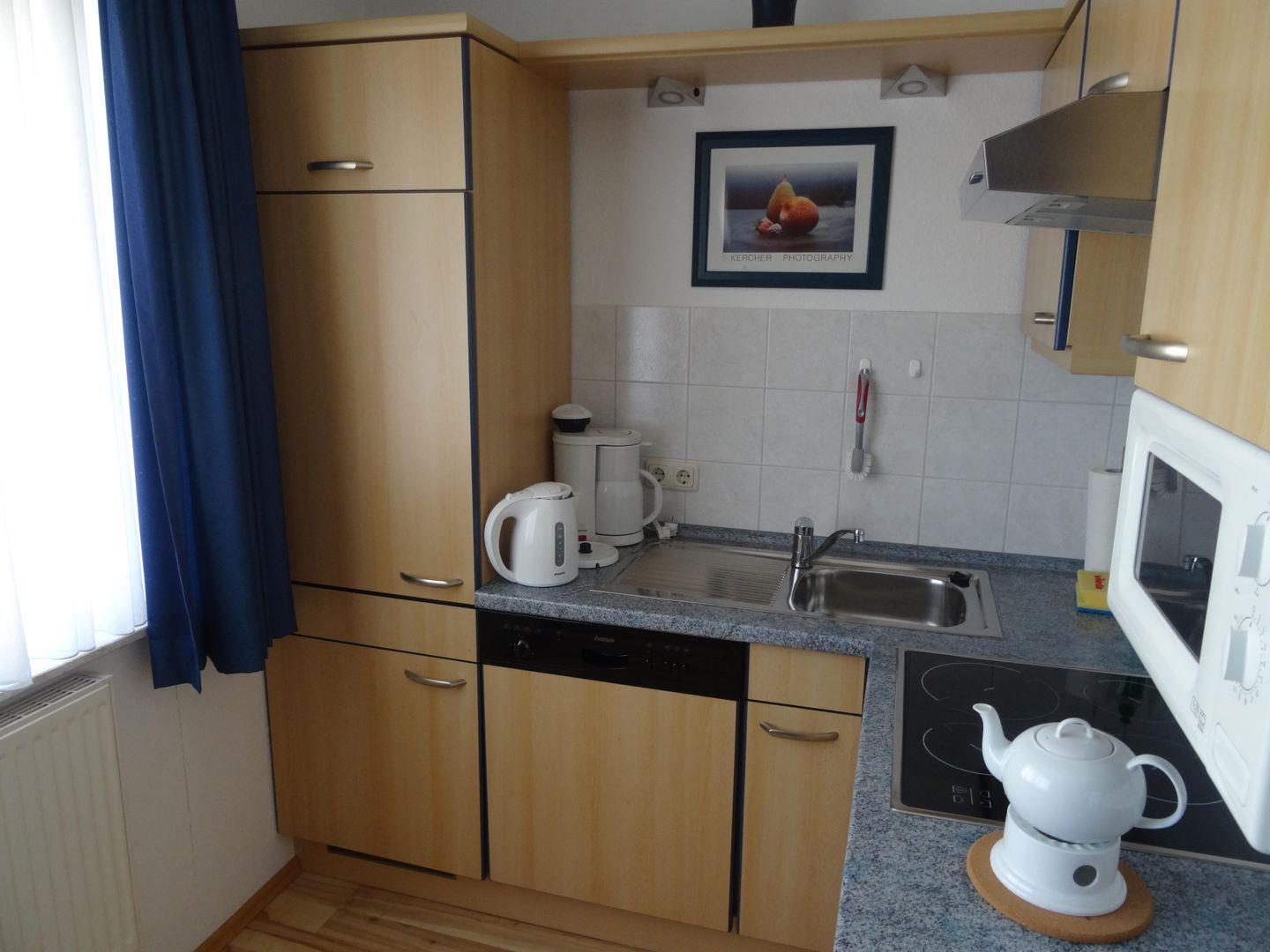 Der gemütliche Wohn-/Essbereich ist schön hell u lädt zum Verweilen ein. Von hier aus gelangen Sie auch auf den Südbalkon. Die Küche bietet alles, was Sie für eine bequeme Selbstverpflegung benötigen
