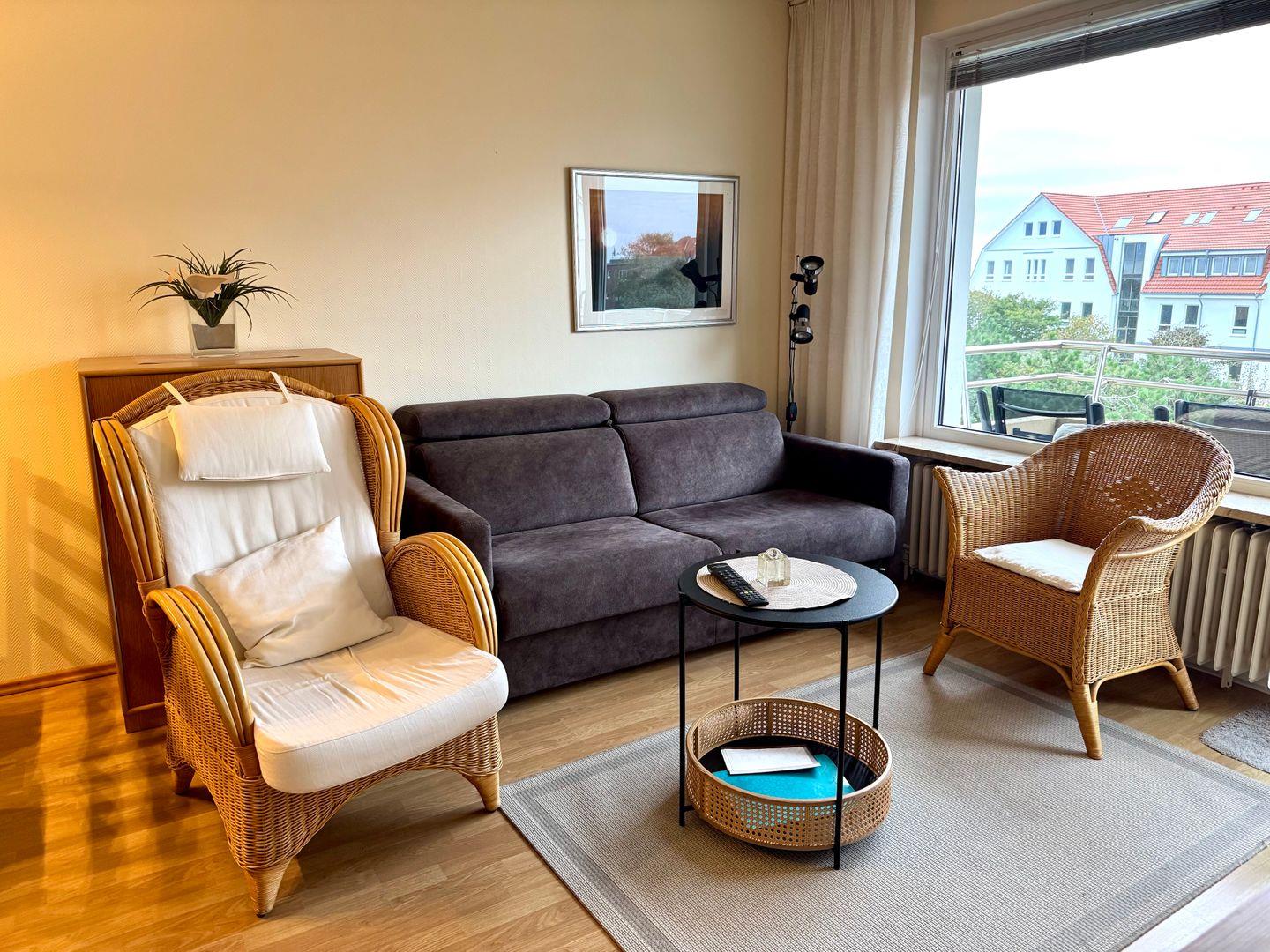 Der gemütlich eingerichtete Wohnbereich mit angrenzendem Südbalkon lädt zum Verweilen ein. In der offenen Küche befindet sich auch alles, was Sie für eine Selbstverpflegung benötigen.