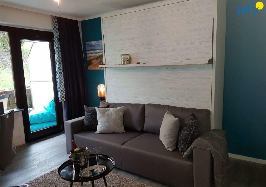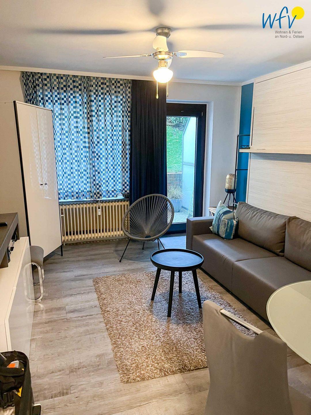 Schlafmöglichkeiten bestehen in der Wangerooger Ferienwohnung durch ein komfortables Wandbett (180x200). Eine raffinierte Technik bietet Ihnen zunächst vor dem Wandschrank ein voll integriertes, massives Sofa. Dieses verschwindet beim Ausklappen komplett unter dem Bett. Der Wohnraum kann verdunkelt werden, sodass Sie eine angenehme Nachtruhe erwartet. Für ein Kleinkind ist ein Babybett vorhanden.