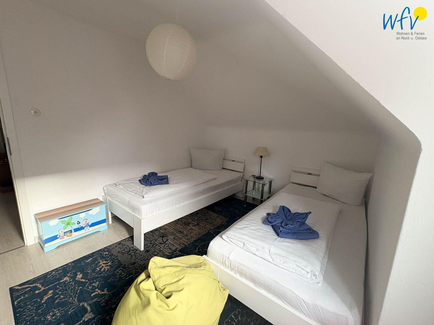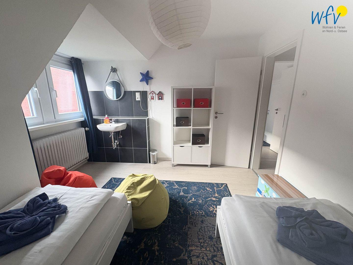 Durch zwei separate Schlafzimmer bestehen in der Ferienwohnung optimale Aufteilungsmöglichkeiten in Eltern- und Kinderzimmer. Während Sie im großen Schlafzimmer ein Doppelbett (180 cm x 200 cm, ein zweiter TV und eine kleine Sitzecke erwartet, ist das kleinere Schlafzimmer mit zwei separaten Einzelbetten (90 cm x 200 cm) und zwei gemütlichen Sitzsäcken eingerichtet. In beiden Zimmern sorgt eine eigene Waschecke mit Waschbecken und Spiegel für zusätzlichen Wohnkomfort in Ihrem Urlaub!