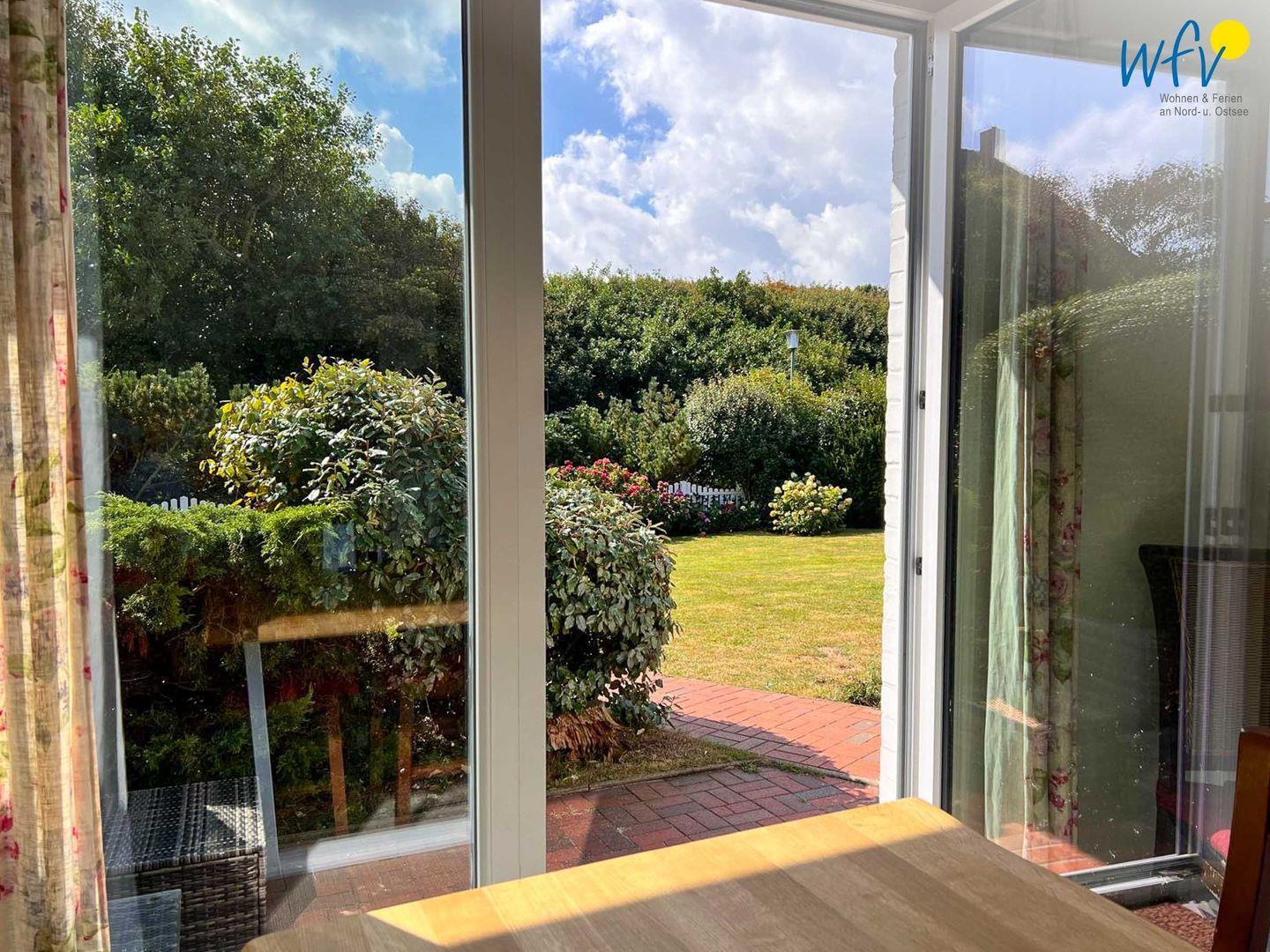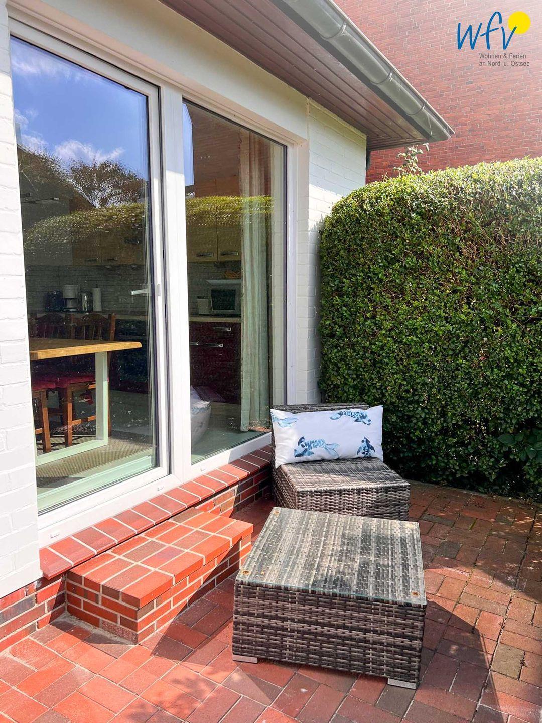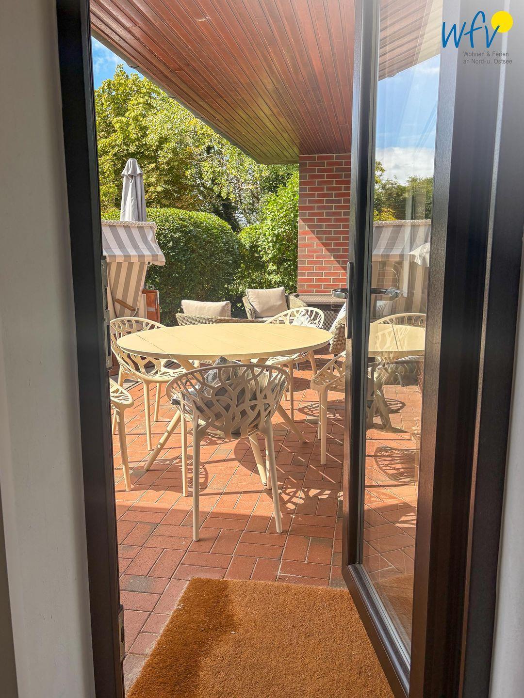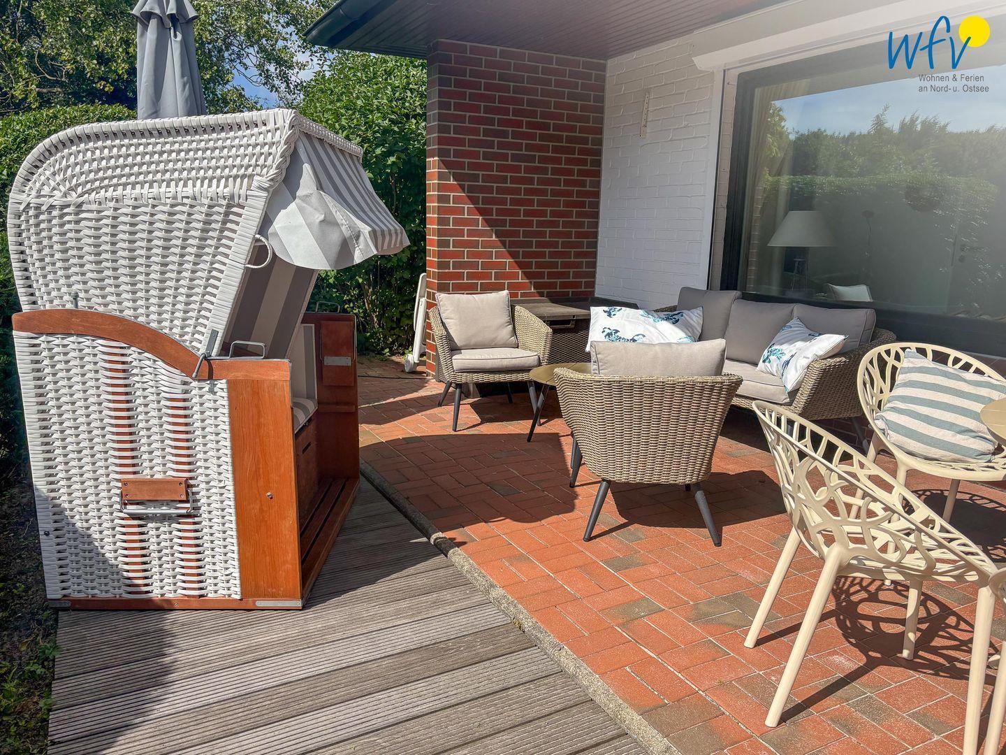 Von der Küche aus gelangen Sie auf die 48 m² große Süd-West-Terrasse mit Garten. Hier wartet auf Sie ein Strandkorb und eine Sonnenliege, außerdem eine Essgruppe mit großem Tisch und fünf Stühlen sowie ein Lounge-Set bestehend aus einem 2-er Sofa, zwei Sesseln und einem Tisch. Das ist pures Urlaubsflair! Die Terrasse liegt geschützt am Haus und ist zur Hälfte überdacht, sodass Sie auch bei einem sommerlichen Regenschauer wohltuende Nordseeluft genießen können. Auf der Küchenterrasse befindet sich ebenfalls ein kleines Lounge-Set zum Relaxen.