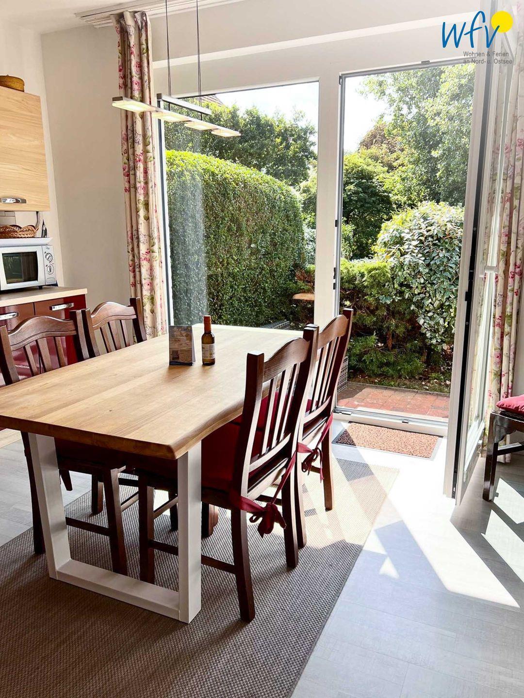 Eine stilvolle Einrichtung in harmonischen Farbtönen verleiht der Wohnung eine Atmosphäre, in der Sie sich auf Anhieb wohlfühlen werden. Herrlich relaxen können Sie besonders in dem gemütlichen Wohnraum mit Couch, TV und CD-Player sowie separater Leseecke mit einigen Büchern. Auch gemeinsame Spielenachmittage können veranstaltet werden; bedienen Sie sich gerne an unserem Schrank voller Gesellschaftsspiele! Ebenso sind Bücher für Erwachsene und Kinder vorhanden. Die breite Fensterfront mit direktem Blick auf die angrenzende Süd-West-Terrasse durchflutet den Wohnraum großzügig mit Sonne und Tageslicht.