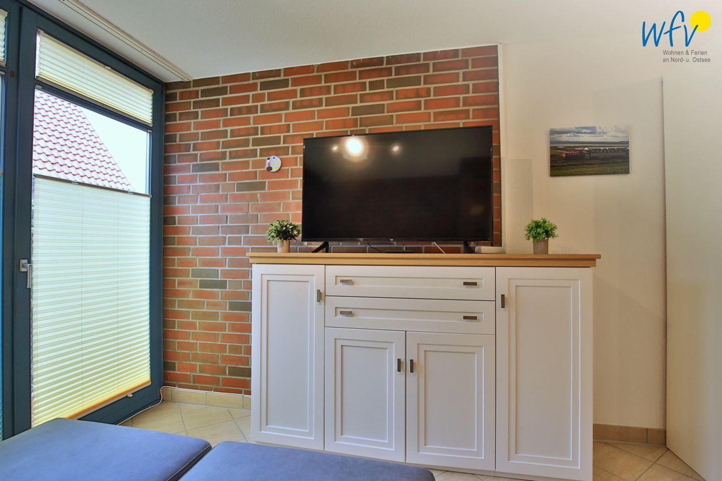 Der helle Wohnraum mit Essbereich sowie einer Couchecke mit modernem TV lädt zum Erholen und Wohlfühlen ein. Große Fenster verleihen dem Raum einen sehr schönen Lichteinfall. Maritime Inselfotos sorgen für das entsprechende Nordseegefühl.