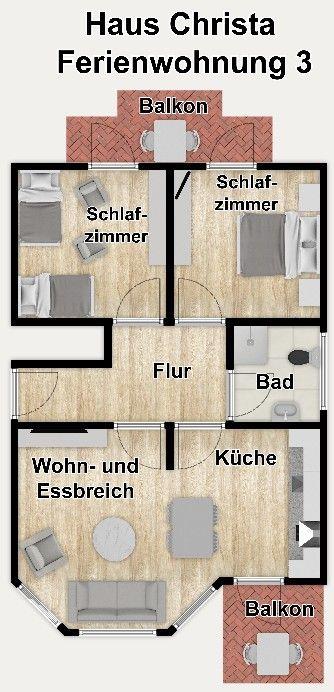 Zwei separate Schlafzimmer bieten Ihnen angenehme Rückzugsmöglichkeiten. Sie sind mit einem komfortablen Doppelbett (180 x 200 cm) bzw. drei Einzelbetten (einem Einzelbett (90 x 200 cm) und einem Einzelbett mit Auszug (80 x 190 cm)) ausgestattet.