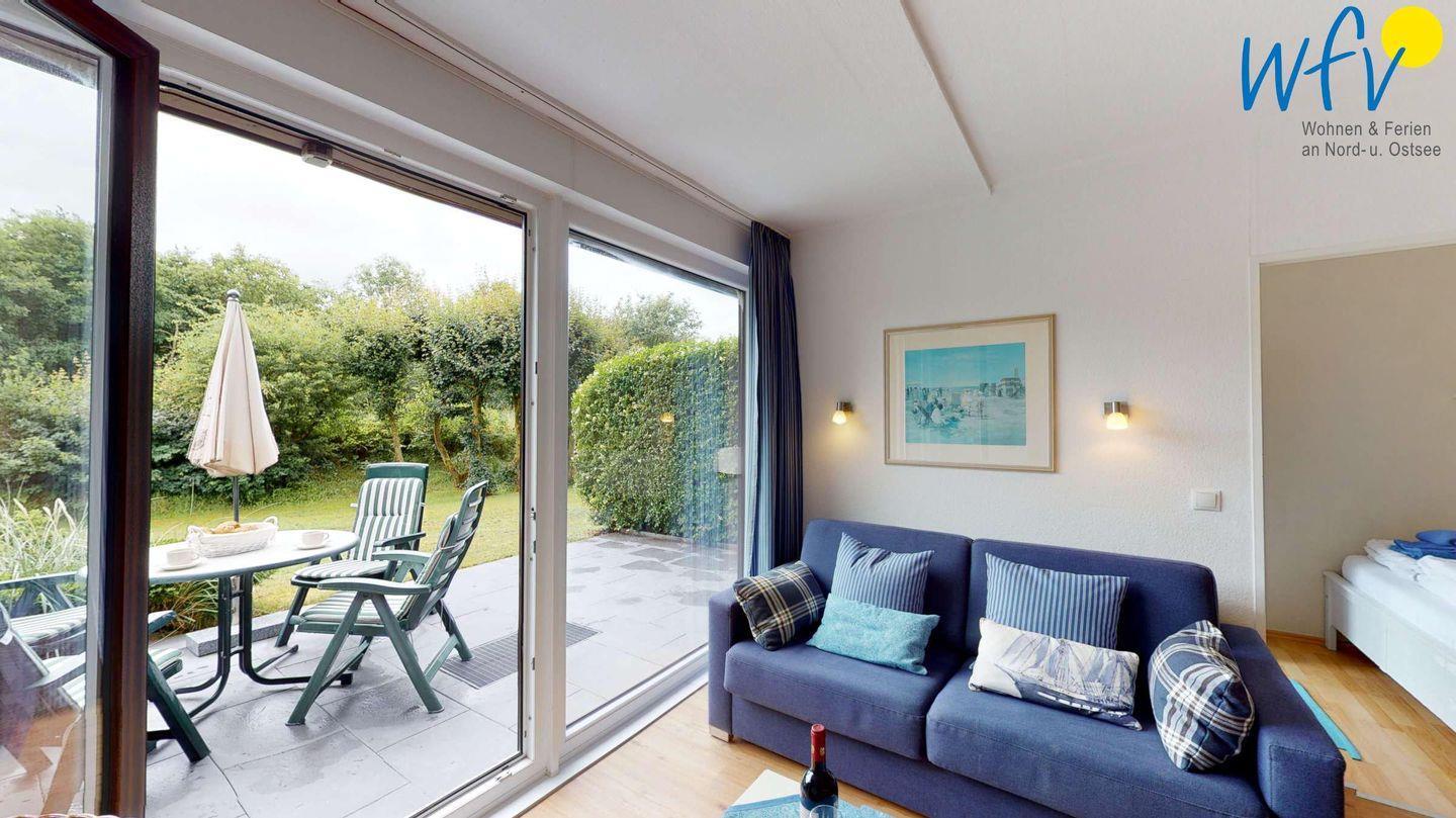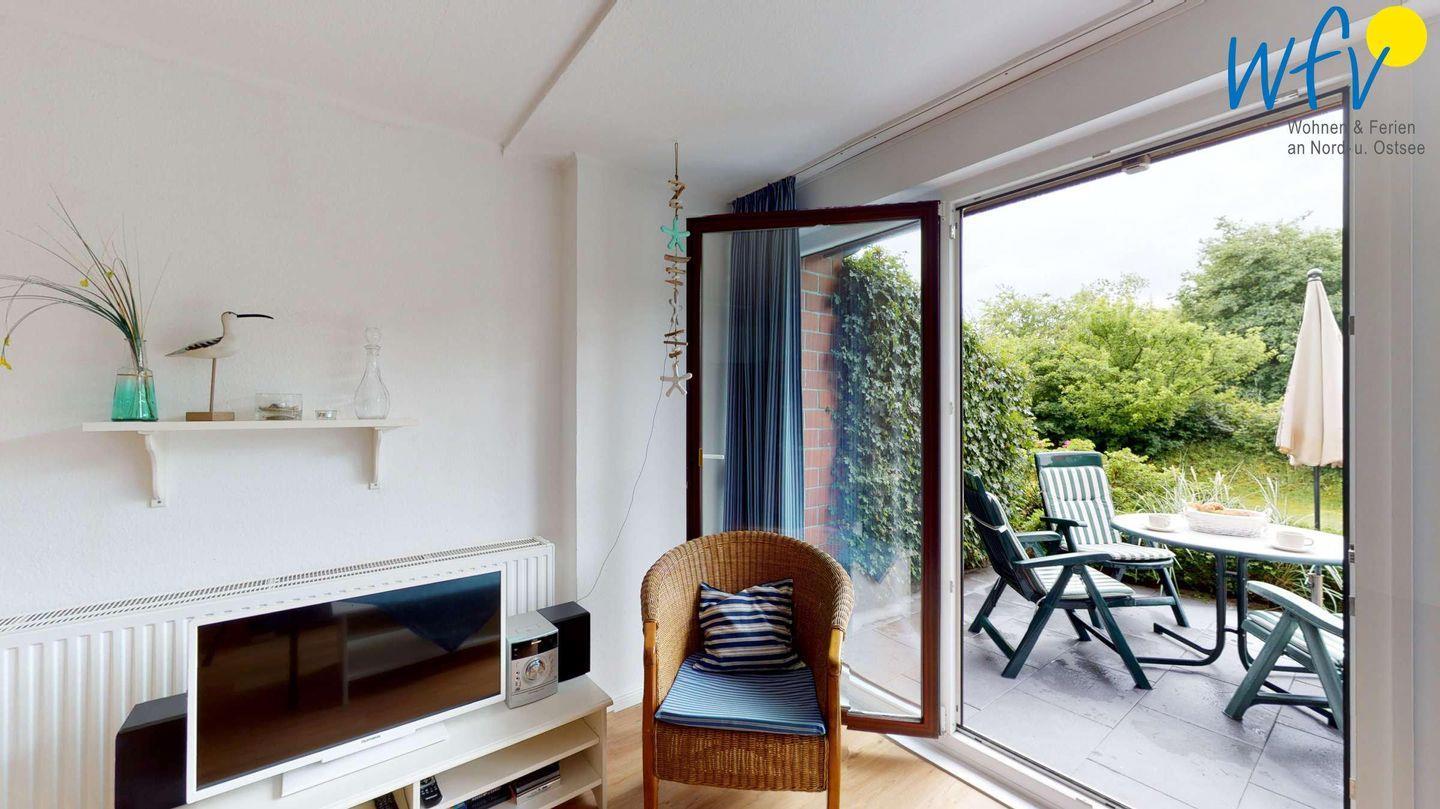 Zum ausgiebigen Entspannen lädt das gemütliche, lichtdurchflutete Wohnzimmer mit Panoramafenster, Essbereich, Couchecke und TV ein. Hier können Sie wunderbar bei offener Terrassentür mit Blick in den Garten zusammensitzen. Oder Sie relaxen im schönen Außenbereich der Ferienwohnung: Auf der windgeschützten Süd-Terrasse mit angrenzendem Garten werden Sie sich wunderbar erholen können. Sich im bequemen Gartenstuhl die Sonne ins Gesicht scheinen zu lassen, ein spannendes Buch zu lesen oder abends bis zum Sonnenuntergang beisammenzusitzen - das sind unvergessliche Urlaubsmomente auf Wangerooge.