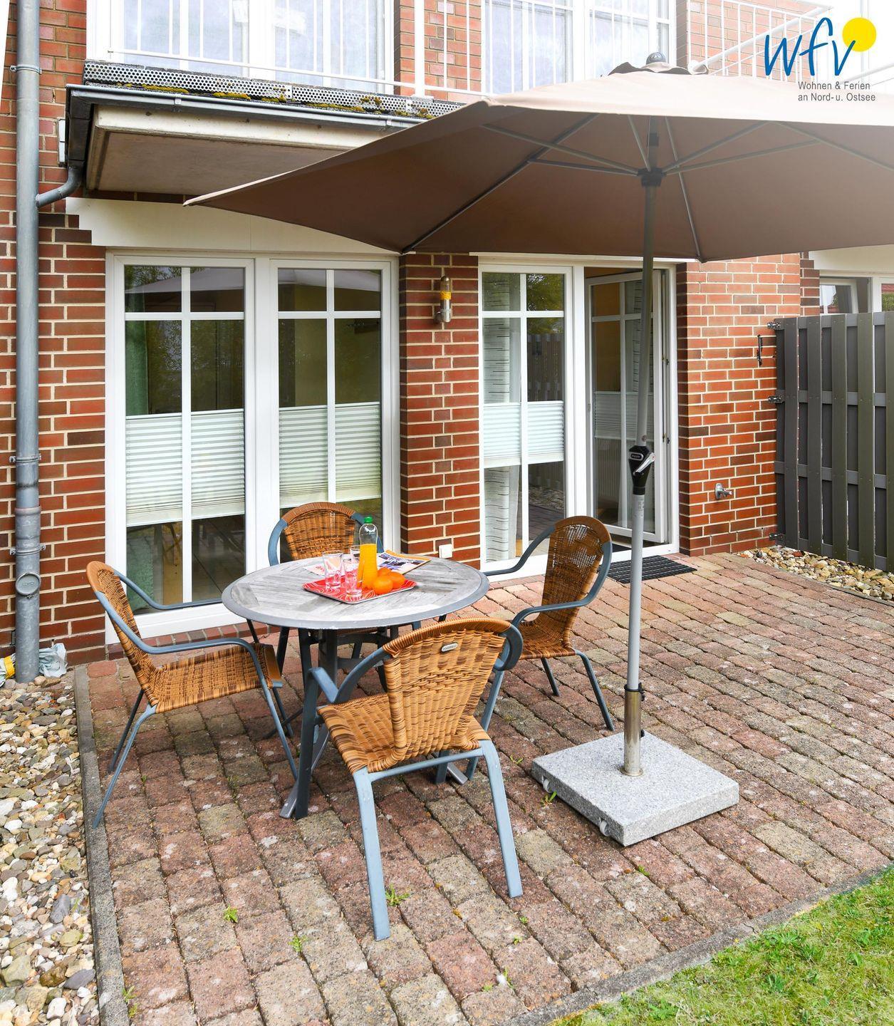 Oder Sie entspannen im Freien bei wohltuender Nordseeluft: Vom Wohnraum aus gelangen Sie direkt auf die hübsch möblierte West-Terrasse mit Garten. Ideal, um Mahlzeiten zu genießen oder den Tag bei einem guten Glas Wein ausklingen zu lassen.