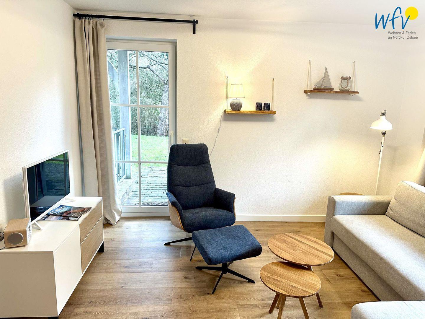 Herrlich entspannen können Sie auch im Wohnraum der Ferienwohnung „Seehund“. Dieser ist u.a. mit einer bequemen Couch sowie TV und Radio ausgestattet. Zum Surfen im Internet empfangen Sie kostenlos freies WLAN.