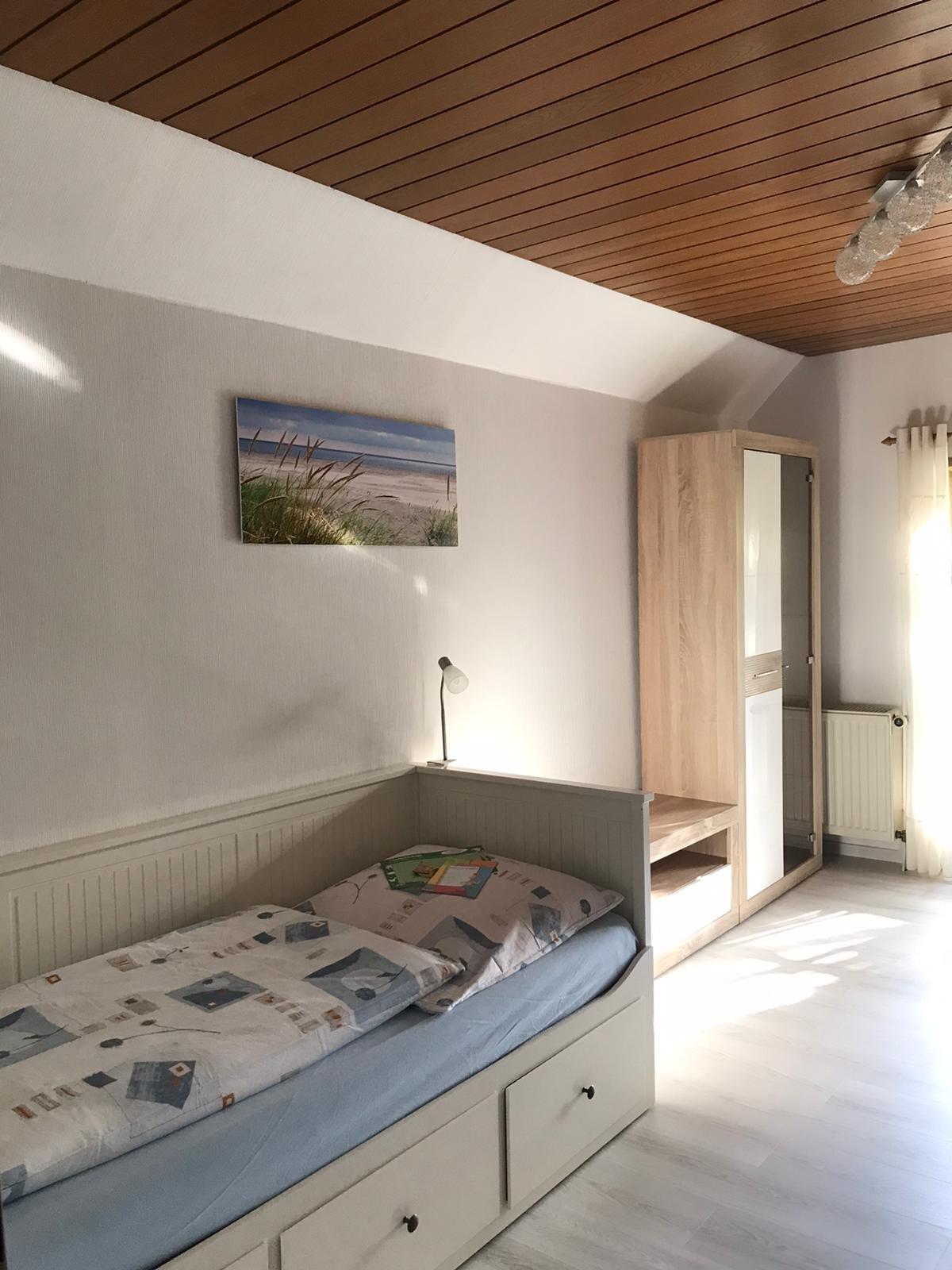 Das Ferienhaus steht direkt auf dem Hof, hat eine Größe von 90 qm und erstreckt sich über 2 Etagen. Im Erdgeschoss liegt das Wohnzimmer mit Fernseher, das (Eltern-) Schlafzimmer, die Küche mit Einbauküche und das Bad mit Dusche/ WC. Das zweite Schlafzimmer ist im Dachgeschoss und eignet sich sehr gut als Kinderzimmer mit bis zu 4 Betten. Zur Wohnung gehören eine große Terrasse und ein Garten, beides befindet sich direkt vor dem Haus. Gartenmöbel und ein Grill sind natürlich auch vorhanden. Für die Kinder gibt es einige Tretfahrzeuge.