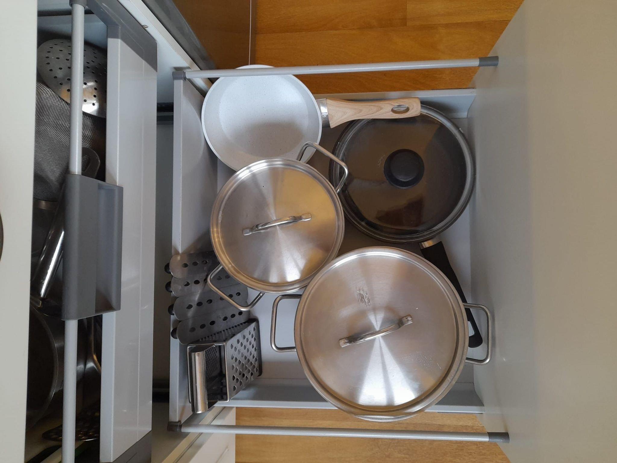 Küche: Voll ausgestattete Küche mit Sitzbereich für bis zu sechs Personen, hellem Tageslicht aus Süden und Westen und Blick auf die Natur. Ein Kinderstuhl ist ebenfalls vorhanden.