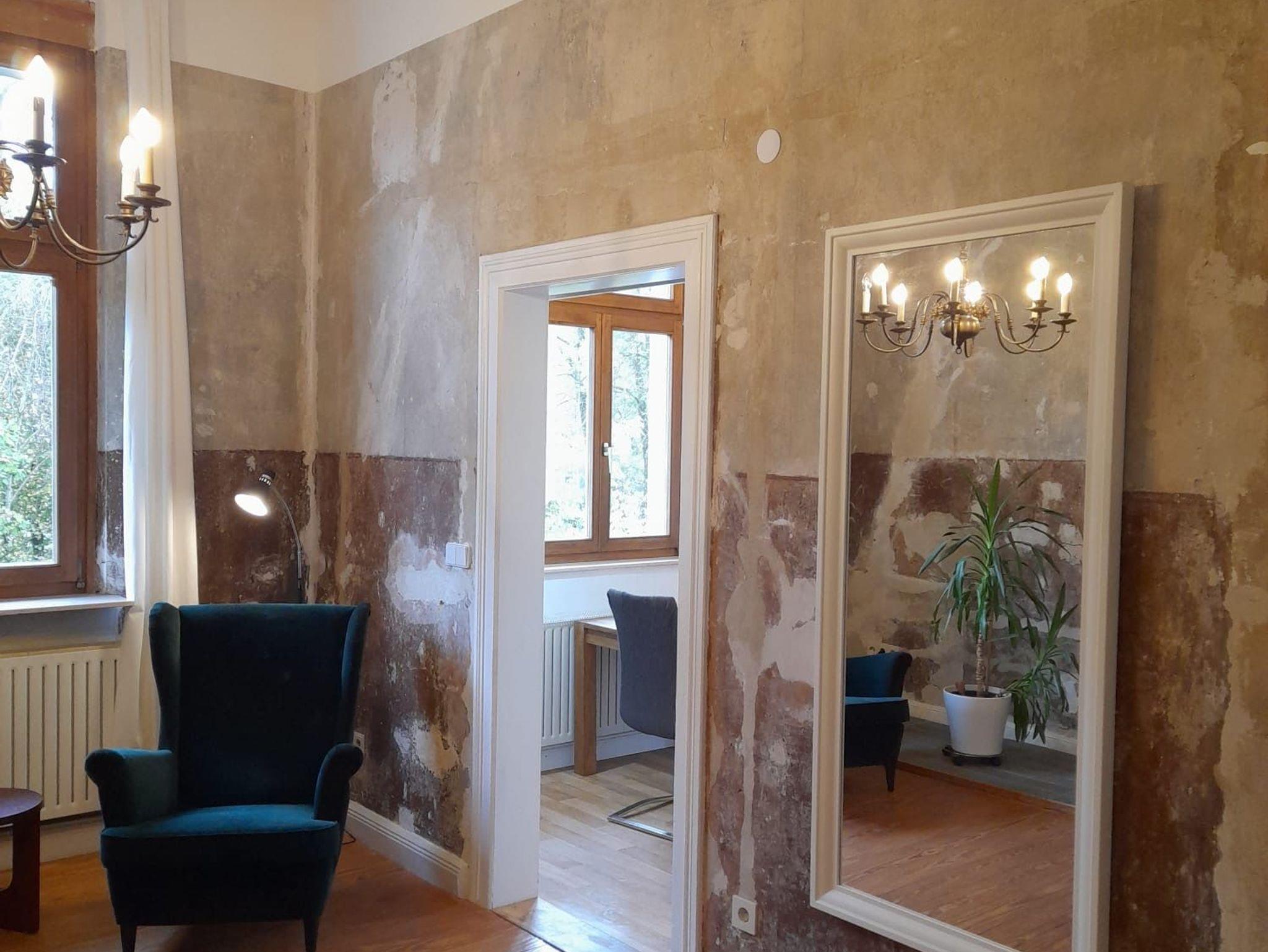 Das großzügige Apartment im ersten Stock betreten Sie über eine eigene Treppe. In der ehemaligen Bahnwärterwohnung empfängt Sie eine hohe Decke (3,50 m) und eine geräumige Diele mit Kamin. Zwei Sessel laden zum Lesen und Entspannen ein.