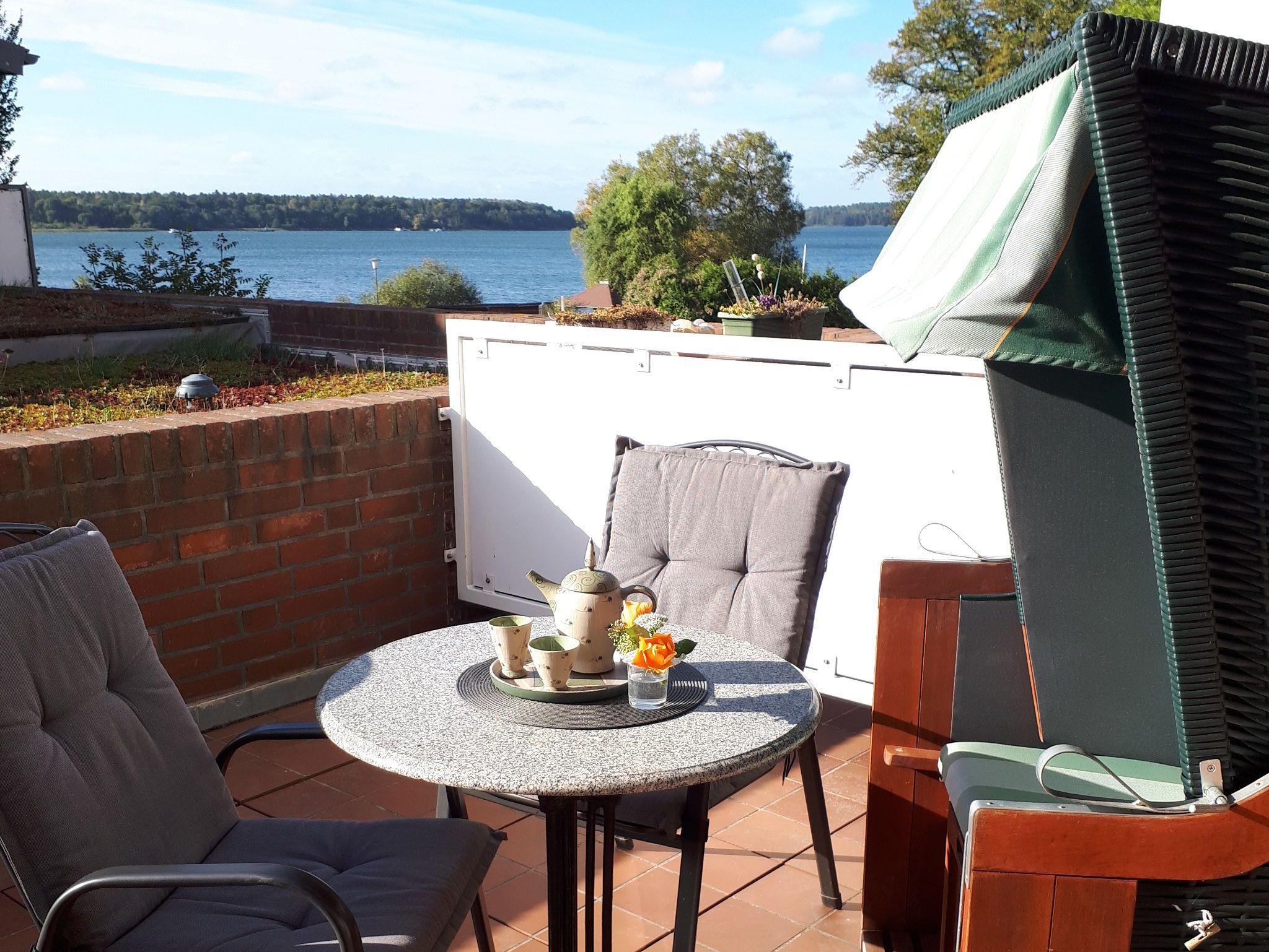 Die große Sonnenterrasse bietet einen schönen Blick auf die Müritz und ist mit einem Sonnenschirm und Balkonmöbeln ausgestattet.