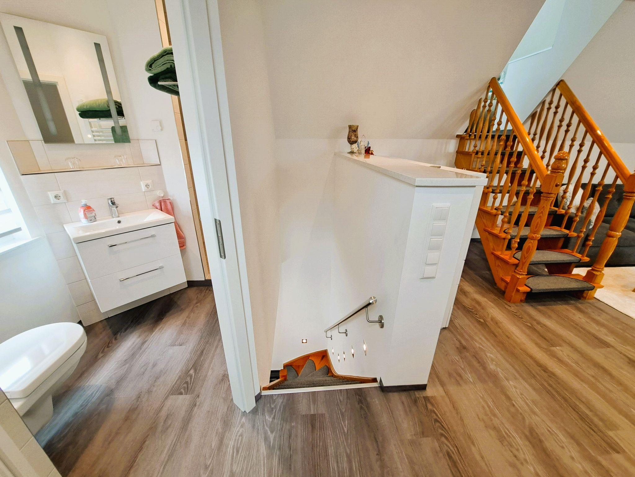 Beim Betreten der Wohnung werden Sie von einem großzügigen Flur empfangen, der mit einer praktischen Schuhablage und einer Garderobe ausgestattet ist ? ideal für einen ordentlichen Einstieg. Ein modernes Gäste-WC rundet das Erdgeschoss ab.