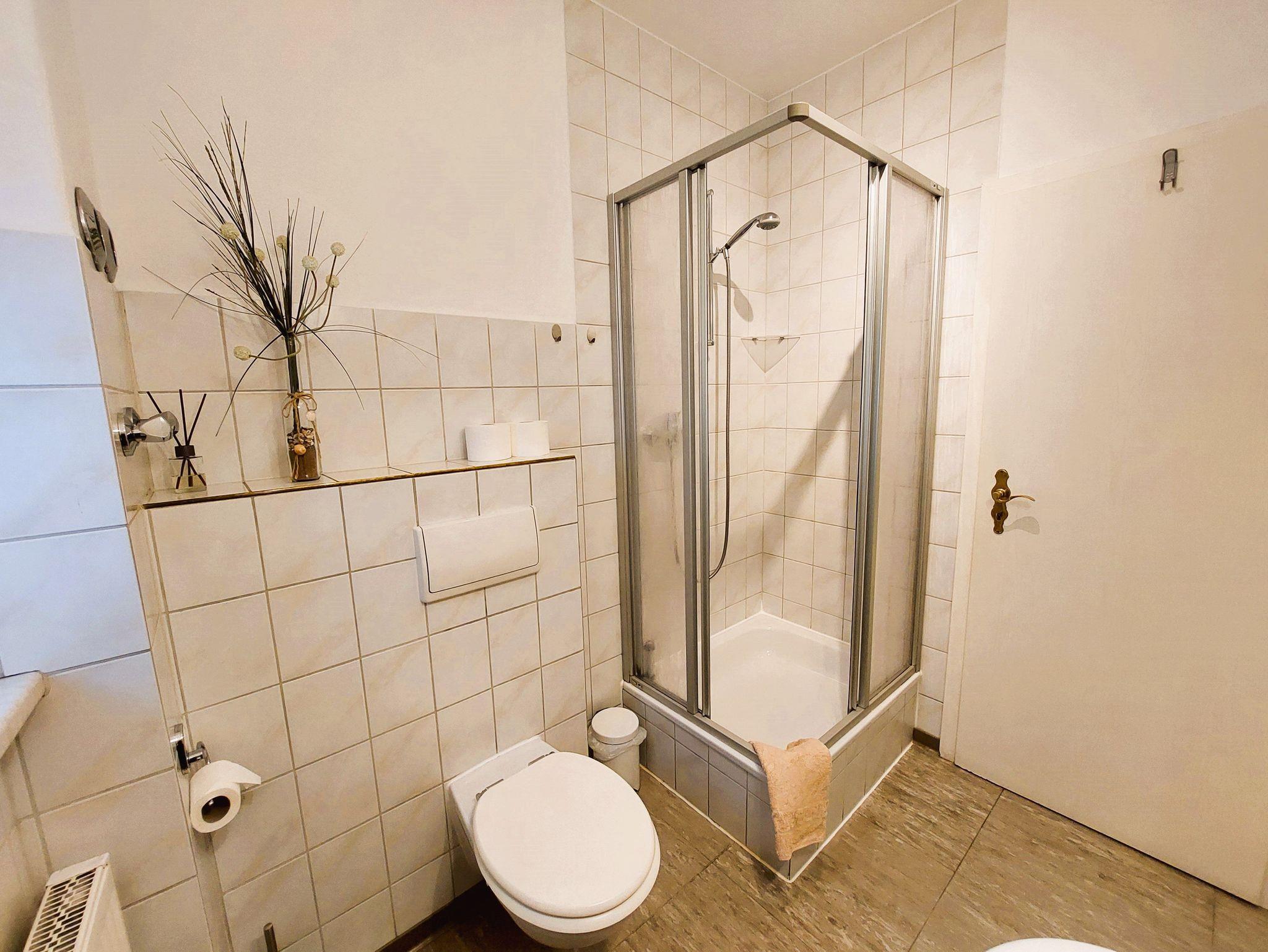 Die Ferienwohnung im 1. Obergeschoss bietet Ihnen ein Wohnzimmer mit Couchlandschaft, FlachTV und einen Tisch für 4 Personen. Das Schlafzimmer verfügt über ein Doppelbett, eine Schlafcouch für eine Aufbettung und Kleiderschrank. Die kleine Einbauküche mit Essplatz und ein Bad mit Dusche und WC beinhalten alles was man benötigt. Die Einrichtung ist sehr gepflegt und neu seit 2021. WLAN steht Ihnen kostenfrei zur Verfügung.