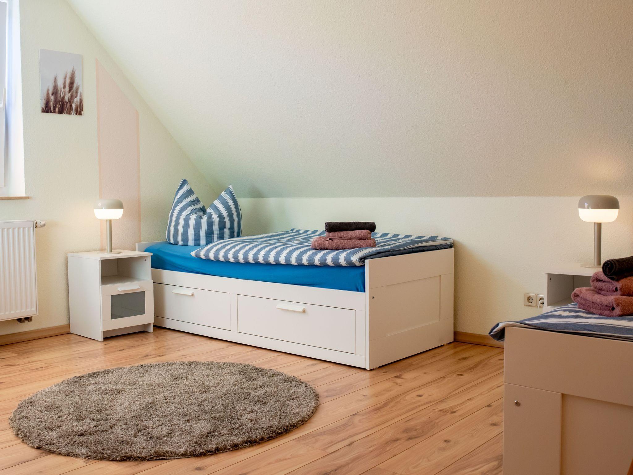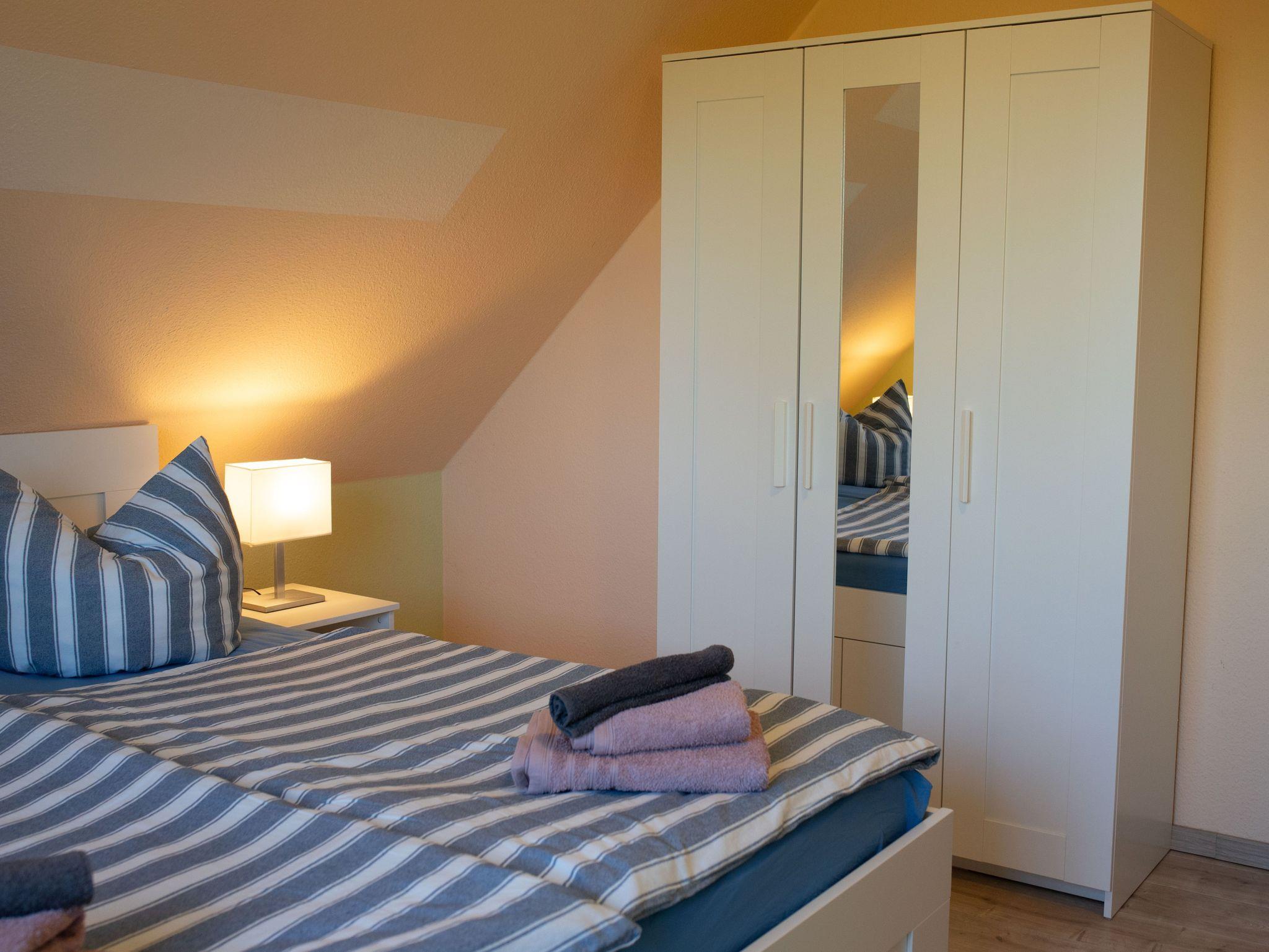 Im Obergeschoss des Hauses befinden sich drei gemütliche Schlafzimmer, die jeweils mit komfortablen Betten ausgestattet. 2 Zimmer verfügen über ein Doppelbett und ein Schlafzimmer über 2 getrennte Einzelbetten, die aber leicht zu einem Doppelbett ausgezogen werden können. Ein großes Badezimmer mit Dusche und Badewanne bietet den Gästen Entspannungsmöglichkeiten nach einem ereignisreichen Tag.