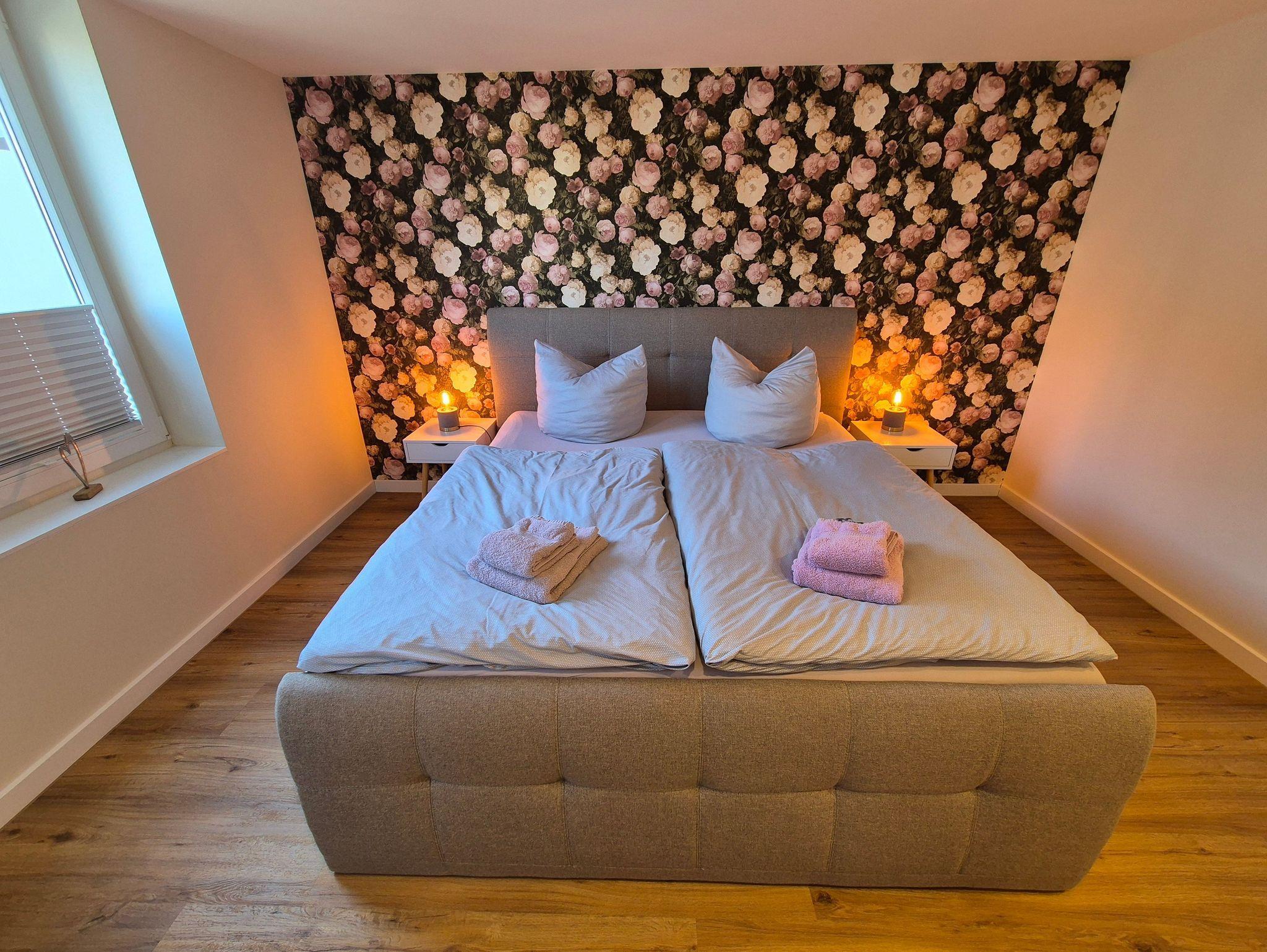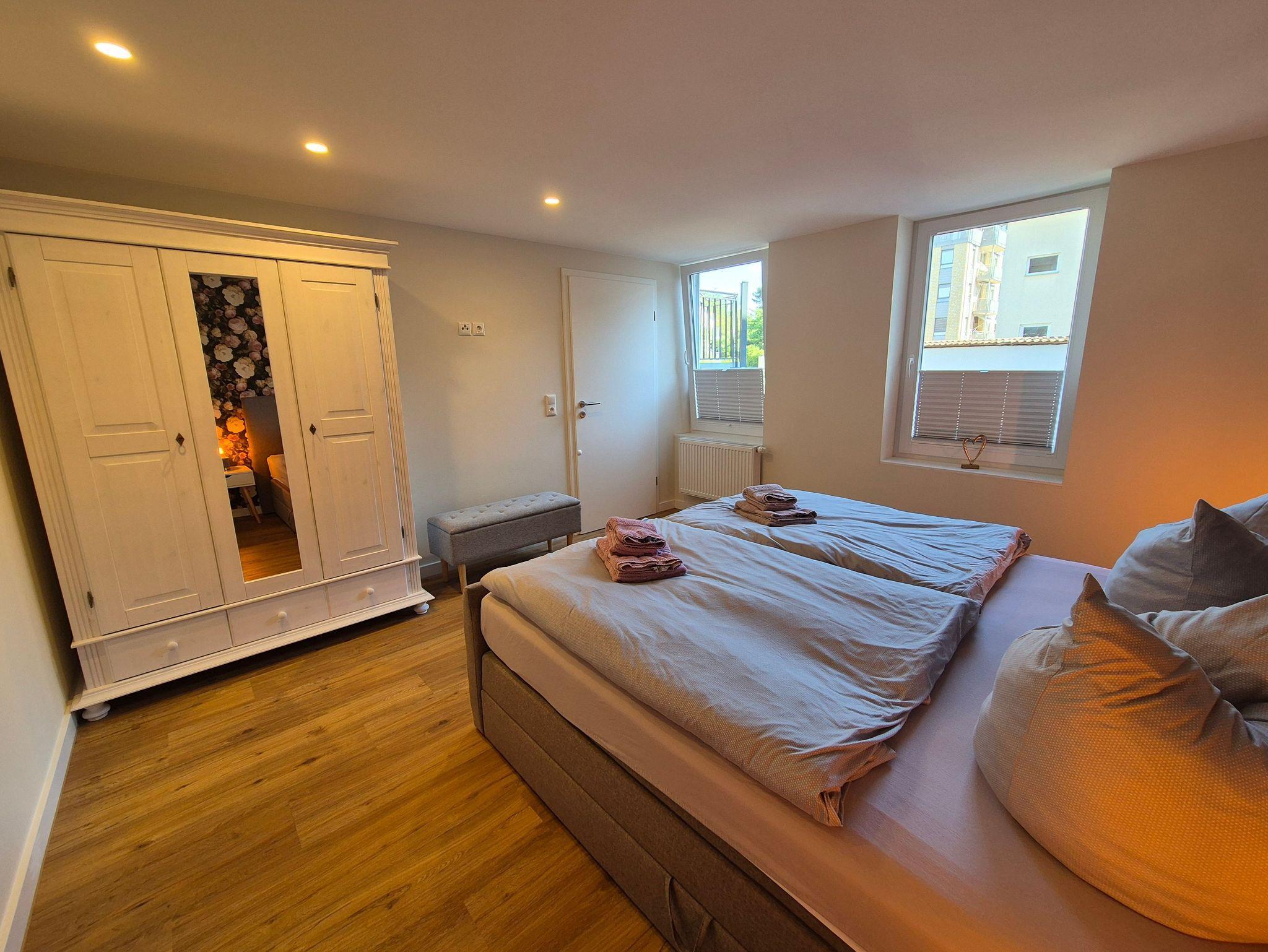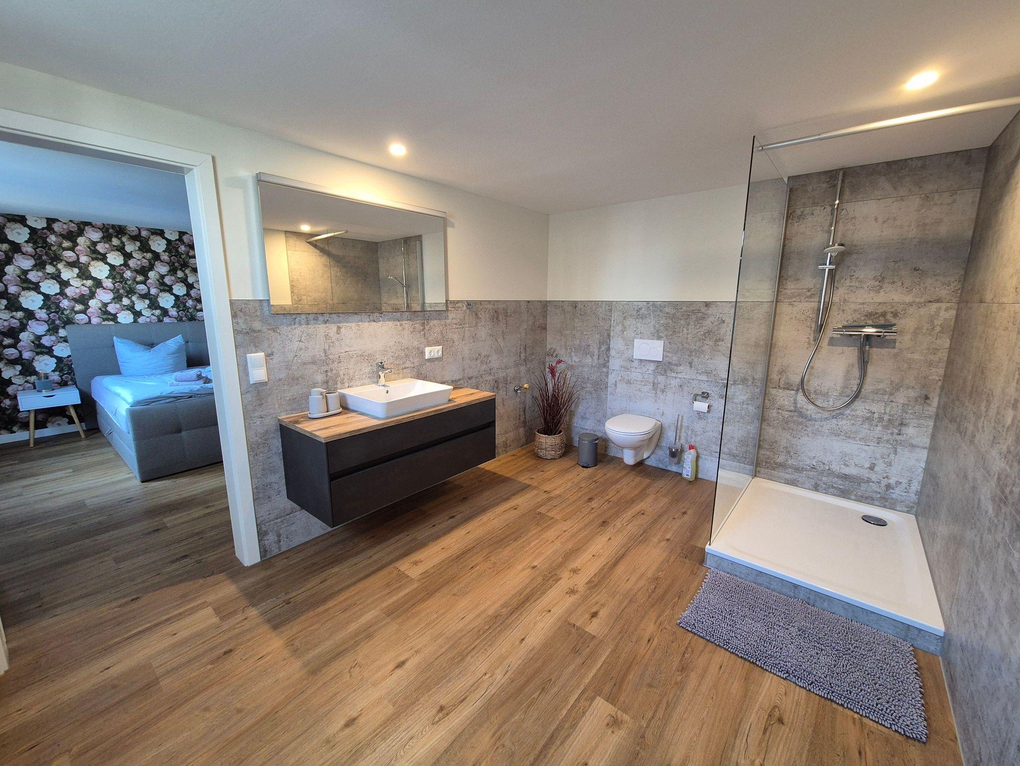 Links vom Flur erwartet Sie das Tageslichtbad mit begehbarer Dusche, Waschtisch und WC. Dahinter finden Sie das gemütliche Schlafzimmer mit einem komfortablen Doppelbett und einem geräumigen Kleiderschrank.