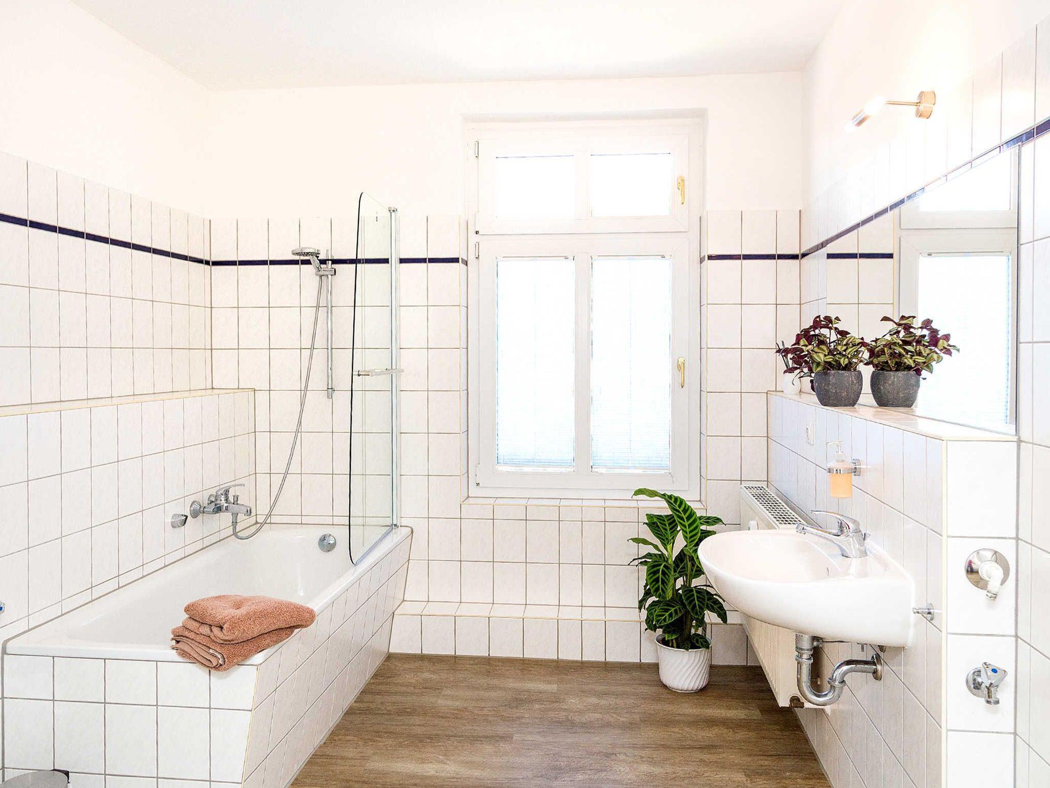 Schon beim Eintritt in den Flur ist zu erkennen mit welch einer Sorgfalt und Geschick hier eingerichtet wurde. Der Boden ist im industriellen Loftdesign gestaltet. Links der Blick in die Küche gibt eine angenehme Atmosphäre frei und strahlt Wohlbehagen aus.