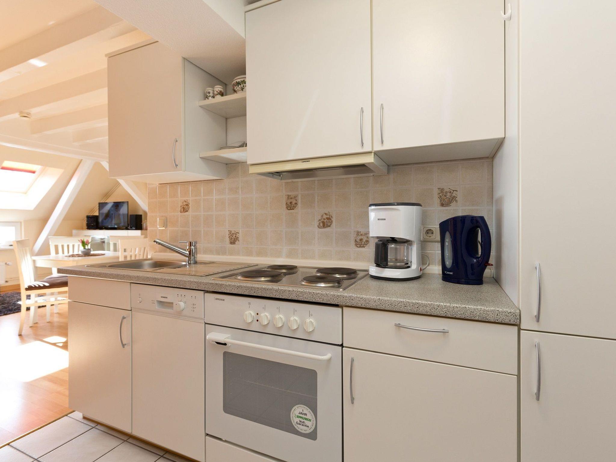 Das Appartement befindet sich in der 4. Etage und besteht aus einem Wohnraum mit integrierter Küchenzeile, einem Doppelbettschlafzimmer. Von hier erreichen Sie über die Treppe die obere Etage und den Zugang zur möblierten Loggia, von welcher Sie den weiten Blick über die Müritz genießen können. Das Wohnzimmer ist modern mit Schlafsofa, Sessel, CD Radio,TV und Esstisch eingerichtet. Die Küchenzeile verfügt über Kaffeemaschine, Wasserkocher, Toaster, Elektroherd, Backofen, Kühlschrank, Geschirr und Besteck.