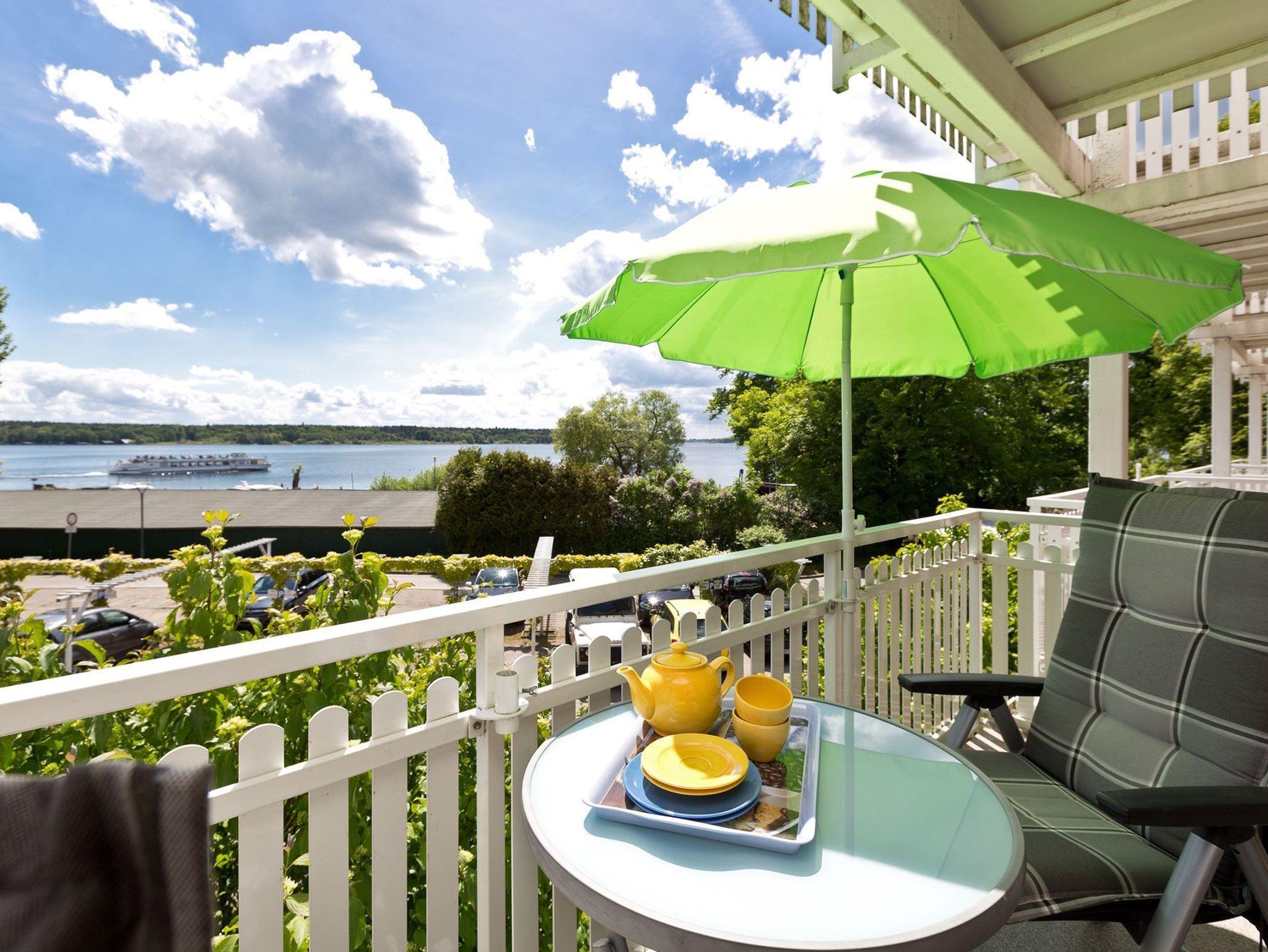 Die schöne Balkon bietet einen schönen Blick auf die Müritz und ist mit einem Sonnenschirm und Balkonmöbeln ausgestattet.