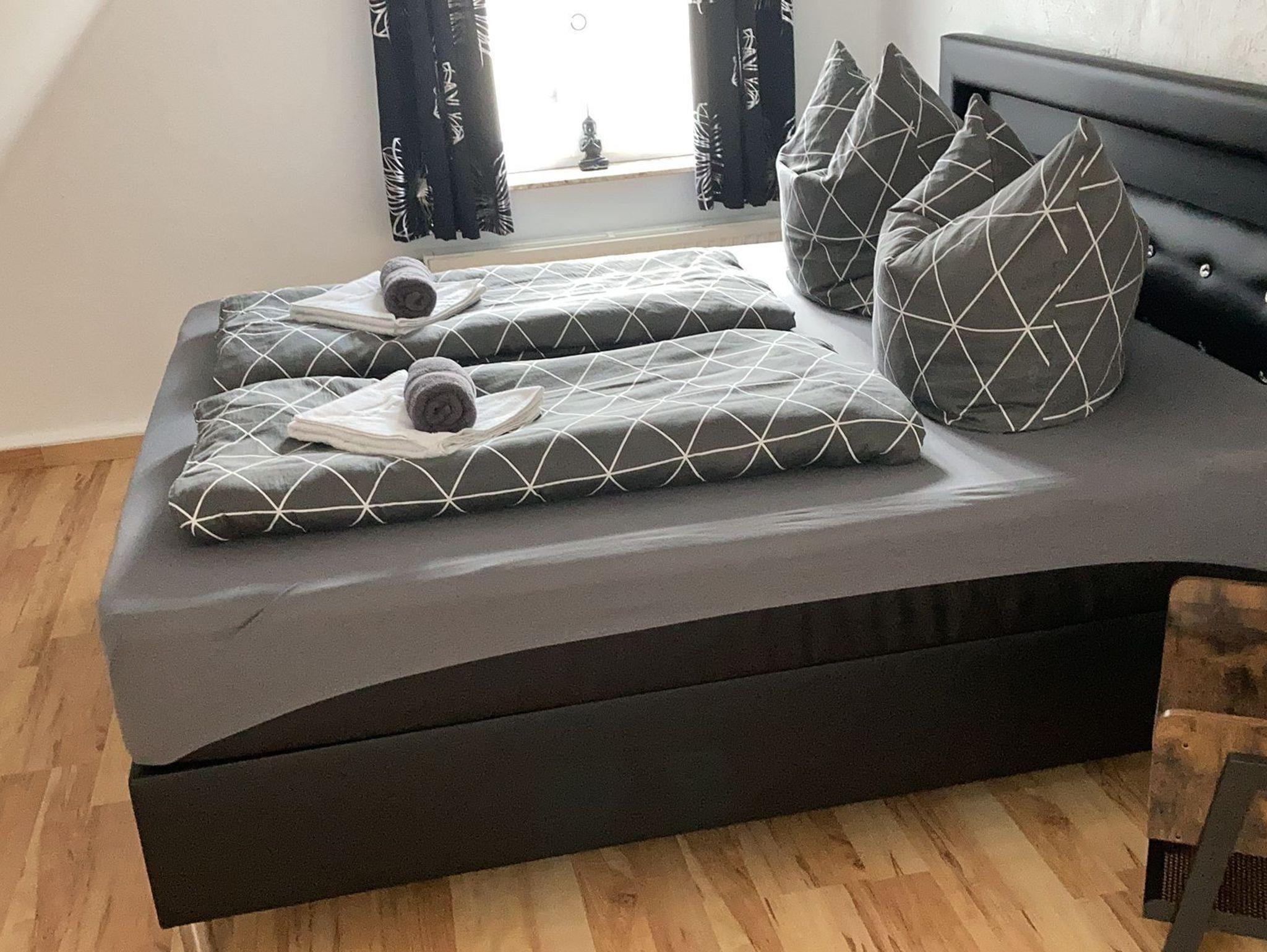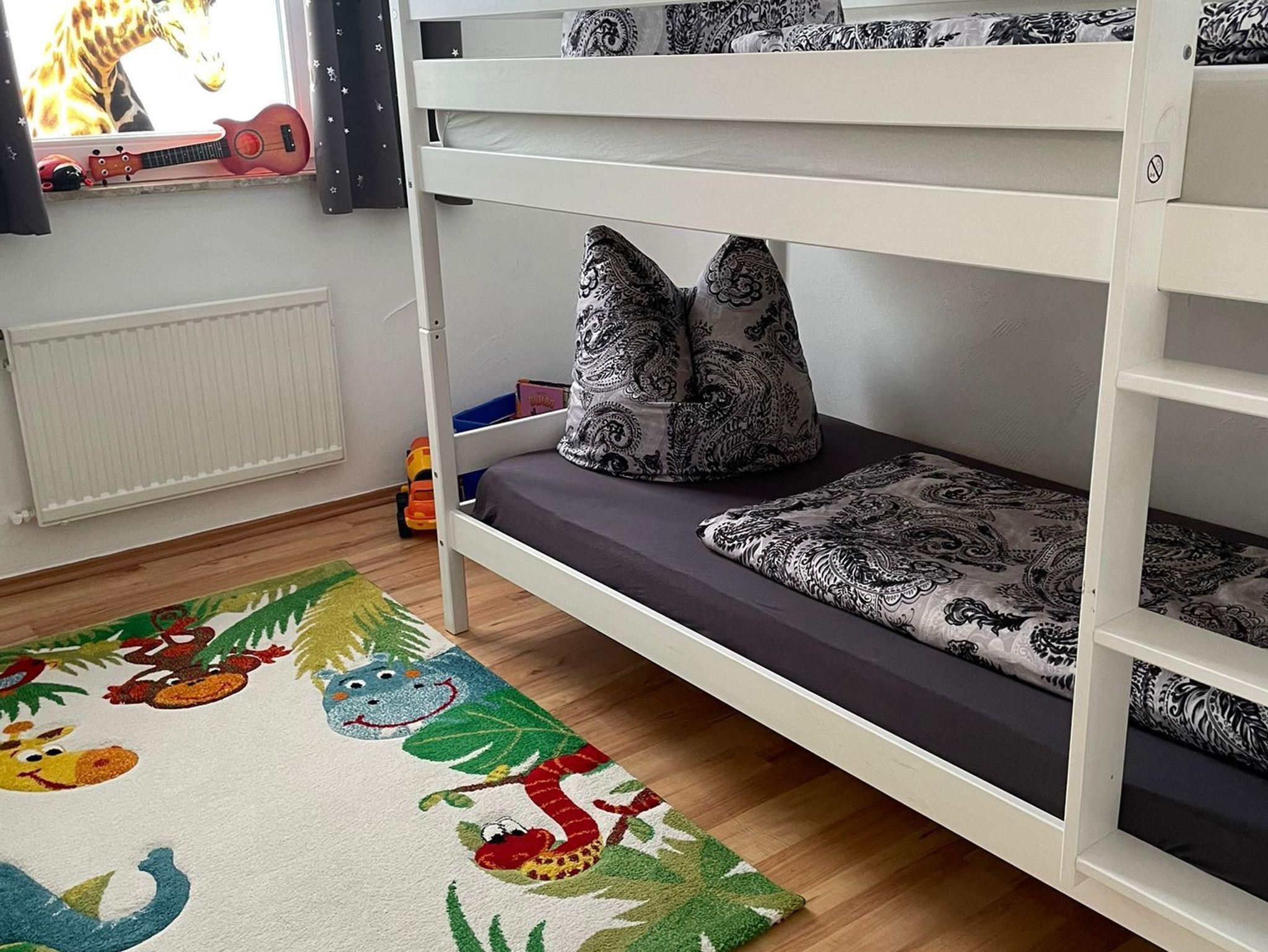 Die Ferienwohnung verfügt über einen Schlafraum mit einem Boxspringbett mit bequemer Schlafhöhe sowie einem Kleiderschrank. Das Einzelbett im zweiten Schlafzimmer besitzt mit 1,40m eine bequeme Breite. Im Kinderzimmer steht ein Etagenbett. Dort sind auch einige Spielsachen für die Kleinen. Ein Bad mit Badewanne, Dusche und WC vervollständigt das Altstadt-Apartment.