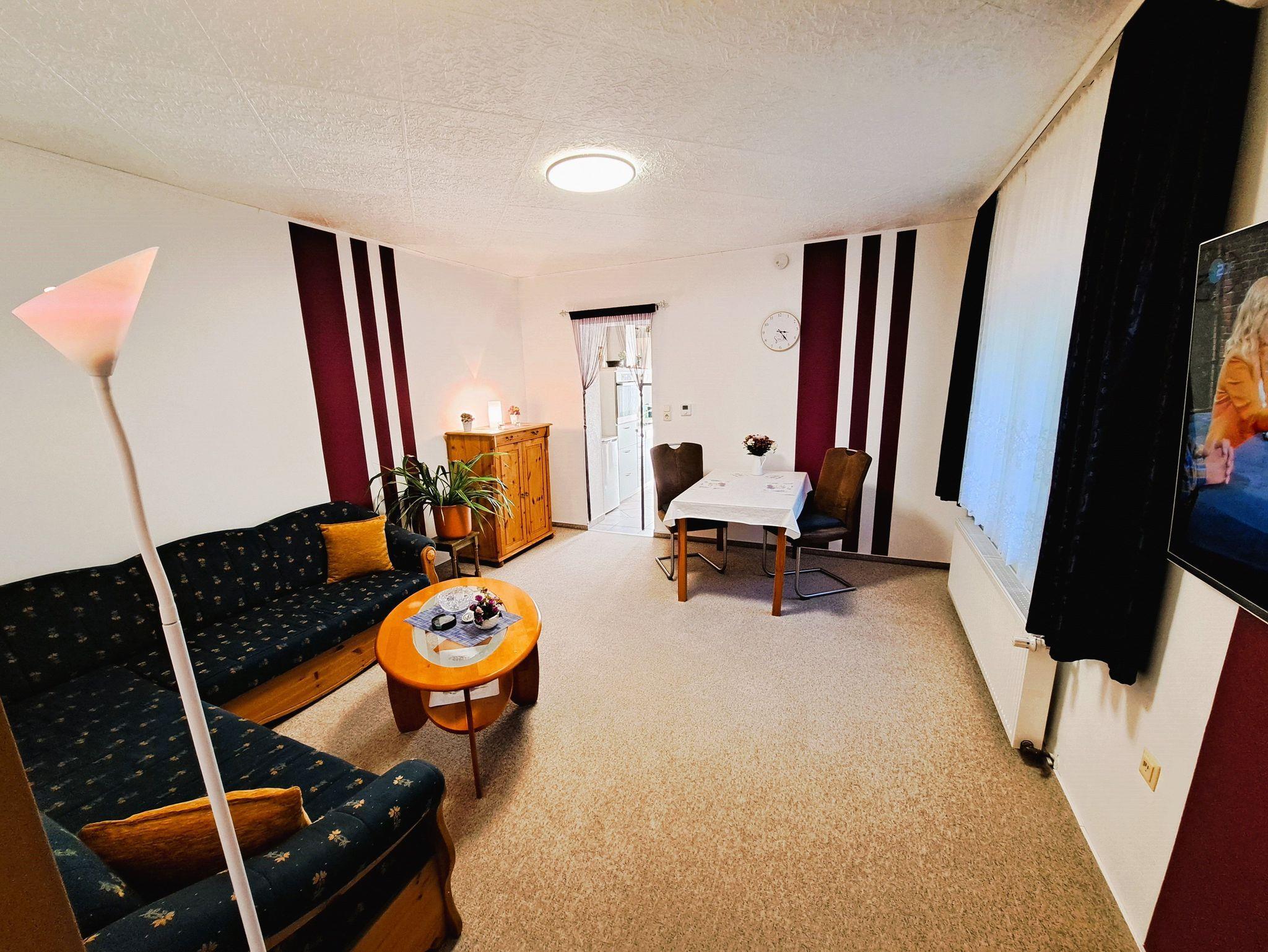 Das großzügige Wohnzimmer ist der ideale Ort zum Entspannen: Machen Sie es sich auf der gemütlichen Couchlandschaft bequem, genießen Sie Ihre Mahlzeiten am Esstisch oder lassen Sie den Abend bei einem Film auf dem TV ausklingen.
