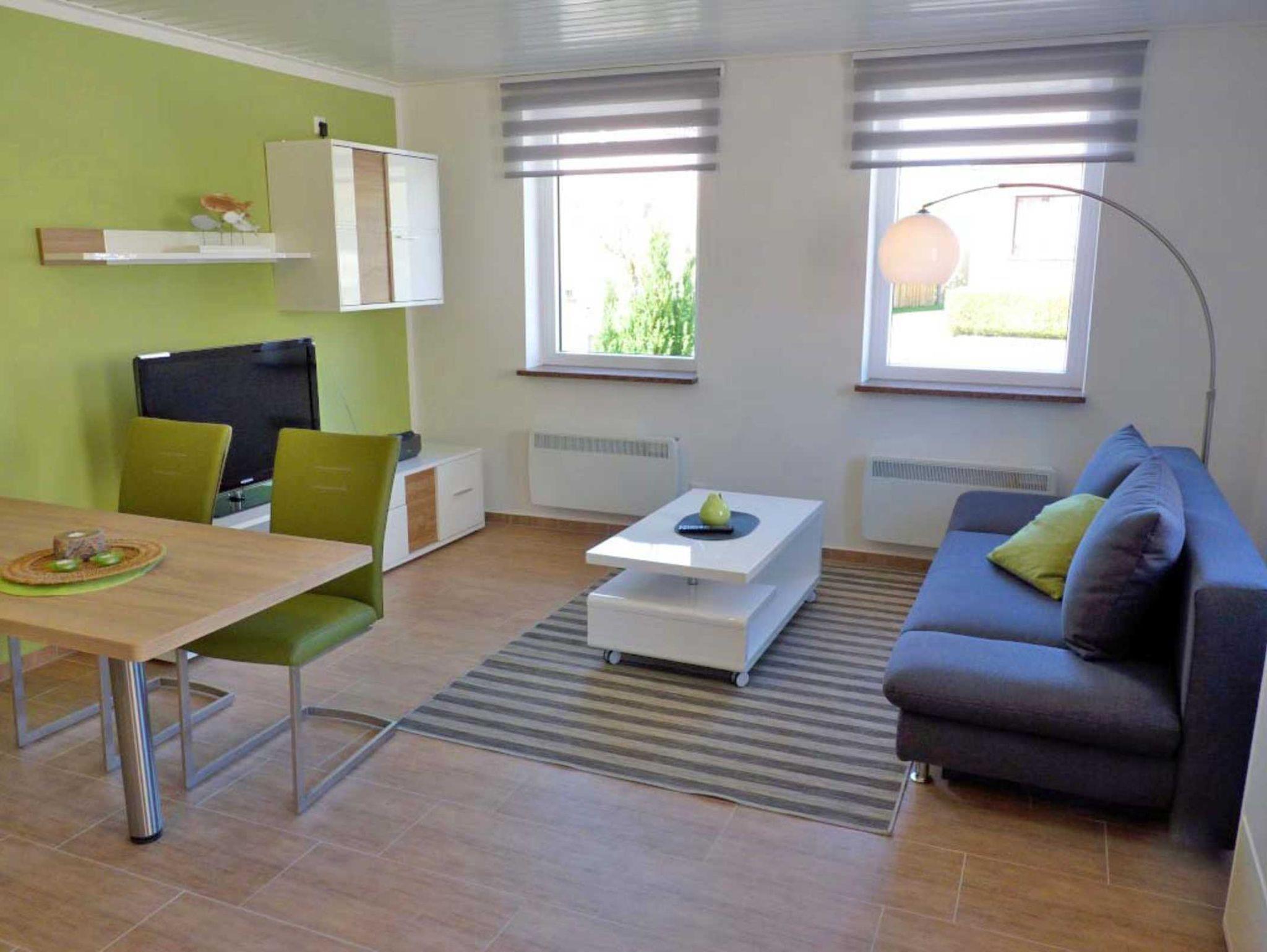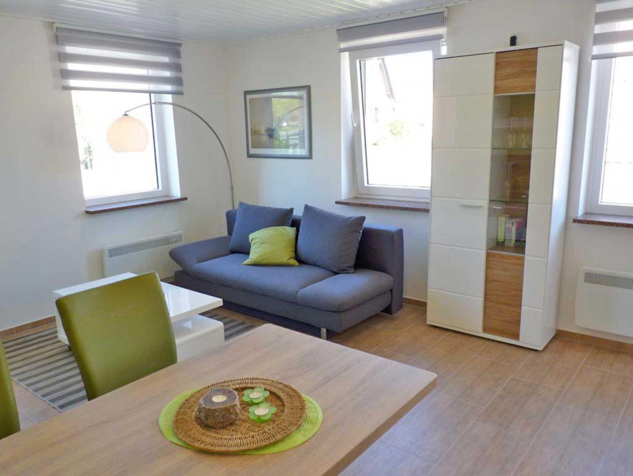 Das Ferienhaus bietet Ihnen ein Wohnzimmer mit Couch und FlachTV, sowie einer integrierten Einbauküche mit Esstisch. Das Schlafzimmer verfügt über eine Doppelbett (1,60 m breit), einem Kleiderschrank und Ablagemöglichkeit. Das Bett steht mit einer Seite direkt an der Wand. Das Badezimmer ist ausgestattet mit großer ebenerdigen Dusche, Waschtisch und WC. Die Inneneinrichtung ist in jedem Zimmer neu und liebevoll von der Vermieterin arrangiert worden.