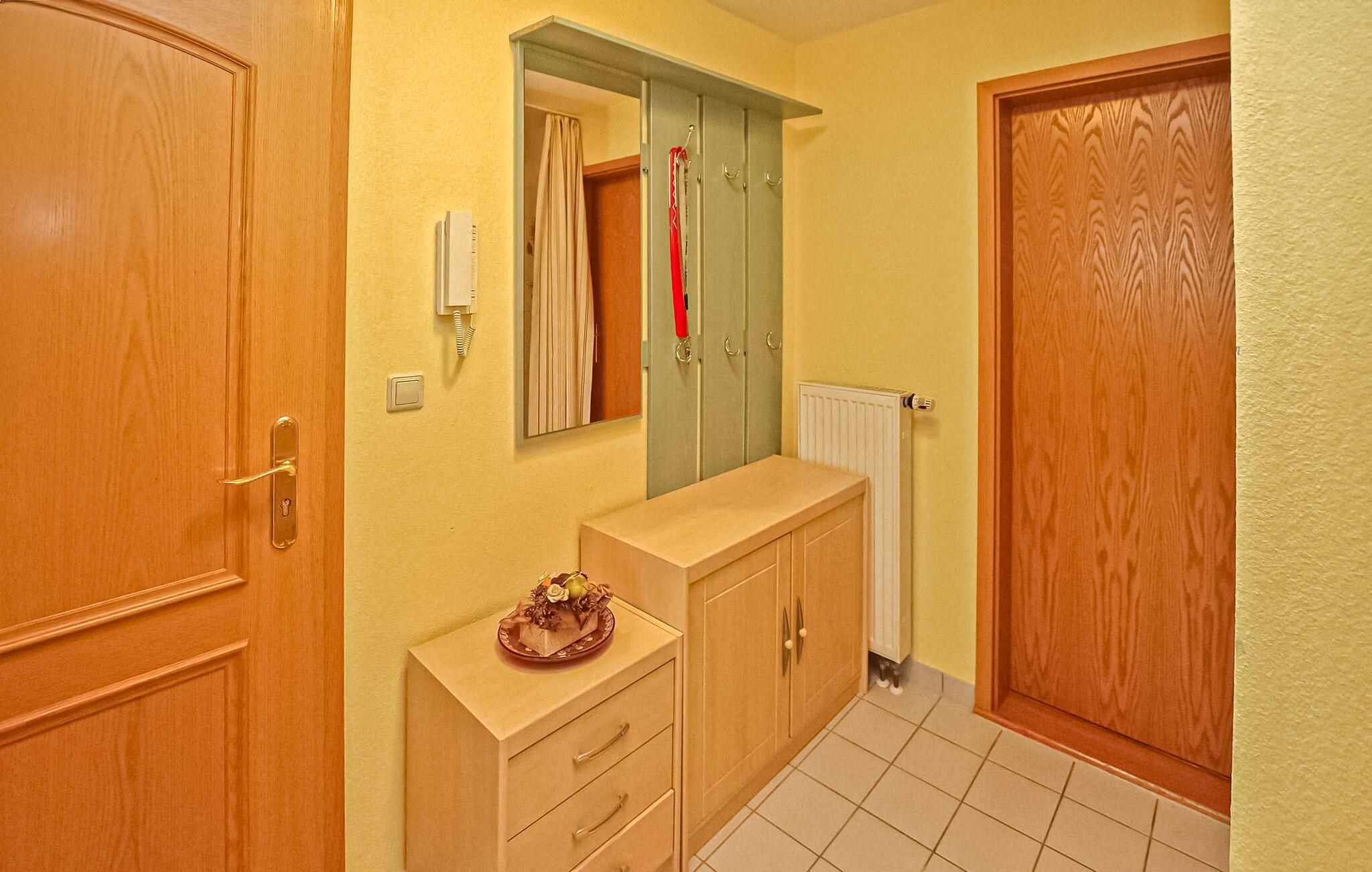 Diese Ferienwohnung befindet sich im EG, rechts. Sie ist ausgestattet mit: Wohnraum (Polstermöbel, Essecke, TV, Radio), offene Küche (E-Herd, Kühlschrank, Essecke, Mikrowelle, div. Küchengeräte), Schlafraum (Doppelbett, Liege), DU und WC (räumlich getrennt), Zentralheizung.