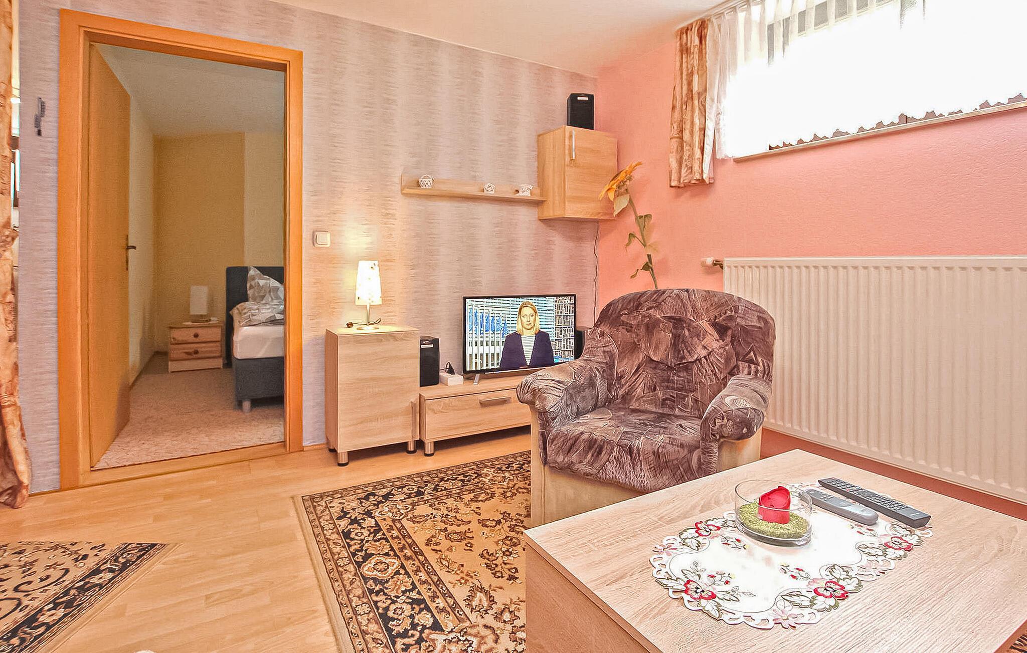 Diese Fewo befindet sich im Souterrain. Separater Zugang. Ausstattung mit: Wohnraum (Polstermöbel, TV, Radio/CD), Schlafraum (Boxspringbett), Küche (E-Kochfeld, Minibackofen, Kühlschrank, Mikrowelle, Essplatz, div. Küchengeräte), DU/WC (mit Fenster), Zentralheizung. Sonnenliegen,Fahrradständer und Parkplatz. Im Gesamtpreis enthalten sind Bettwäsche, Handtücher, Energie- u. Wasserverbrauch und Endreinigung. Vor Ort zu zahlen: Kurtaxe.