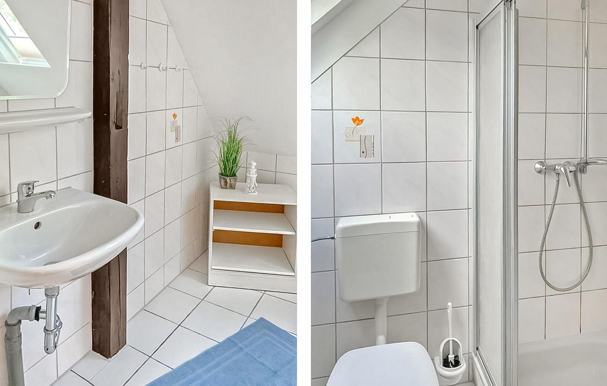 Die ca. 40 qm große, 2020 renovierte Nichtraucher-Ferienwohnung mit separatem Eingang ist über eine Außentreppe erreichbar und ausgestattet mit einem Wohnraum (Polstermöbel, Schlafcouch; Aufbettung für 2 Personen, Esstisch, Flachbild-TV, Radio mit Kassettenspieler), offener Küche (Ceran-Kochfeld, Kühlschrank mit Gefriermöglichkeit, Mikrowelle, div. Küchenkleingeräte), einem Schlafzimmer (zwei Einzelbetten), einem Bad (Dusche, WC) sowie einem zustellbaren E-Heizkörper.